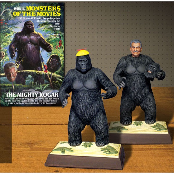 Kogar was one of the more animated gorillas played by suit actor Bob Burns. Seen in many TV shows and movies, he was a fixture in Southern California at public events for years from theme parks to store openings to contests. Tracy the Gorilla was seen on TV with Larry Storch and Forrest Tucker in the 1970's "Ghost Busters" Saturday morning show that predated the Ghostbusters film. Bob was credited with being his "trainer". Kogar comes complete with Bob Burns head, Tracy head, and the Kogar head. Base included matches the Monsters of the Movies base with clapboard nameplate. Approximately 1/12th scale. Paint and glue required for final assembly.
