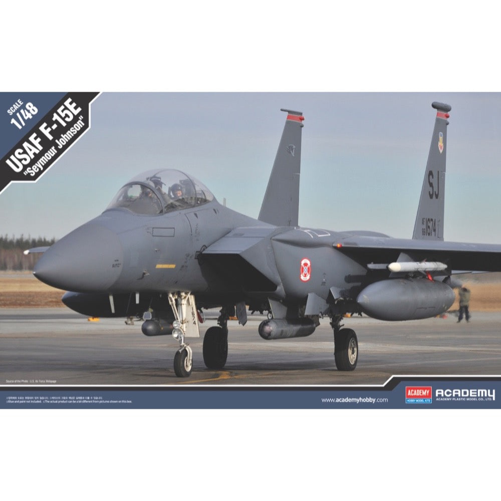 Academy brings us a new model kit of the F-15E Strike Eagle known as Seymour Johnson! The enhanced detail on the body parts includes fully engraved panel lines and rivets; the cockpit interior and landing gear are also highly detailed. Two lifelike pilot figures are included, as are a variety of armaments and accessories such as the Sniper XR, AIM-120, AIM-9, GBU-31, GBU-12 and more.