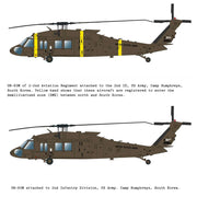 Markings for 5 aircraft: (1) US Army UH-60M of 2–2nd AVN, 2nd ID, Camp Humphreys, South Korea. Yellow band shows aircraft is registered to enter Demilitarized Zone (DMZ) between North and South Korea, with armaments removed; (2) US Army UH-60M of 2–2nd AVN, 2nd ID, Camp Humphreys, South Korea; (3) US Army UH-60M of B Company "Jokers", 3–227th AHB, 1st Cavalry Division, Fort Cavazos, Texas; (4) US Army UH-60M of 3–1 AHB, 1st UD; (5) Australian Army UH-60M, one of 40 aircraft (A60–001–040) arriving since 2023.