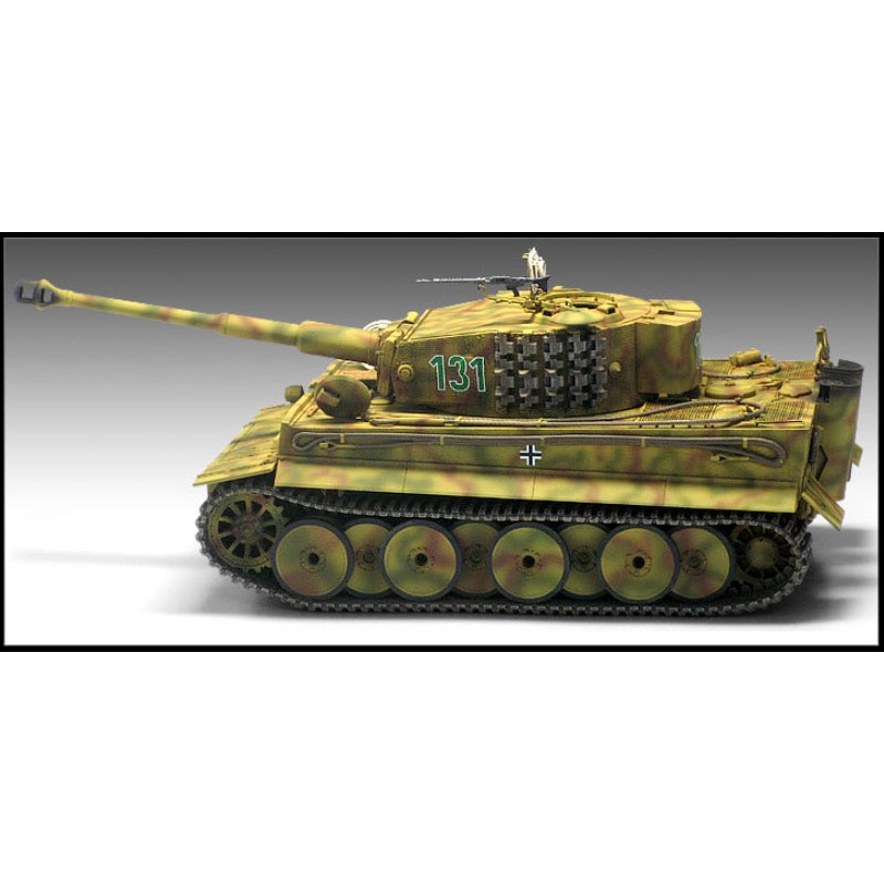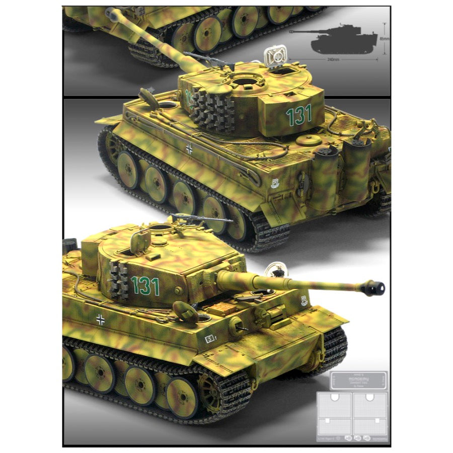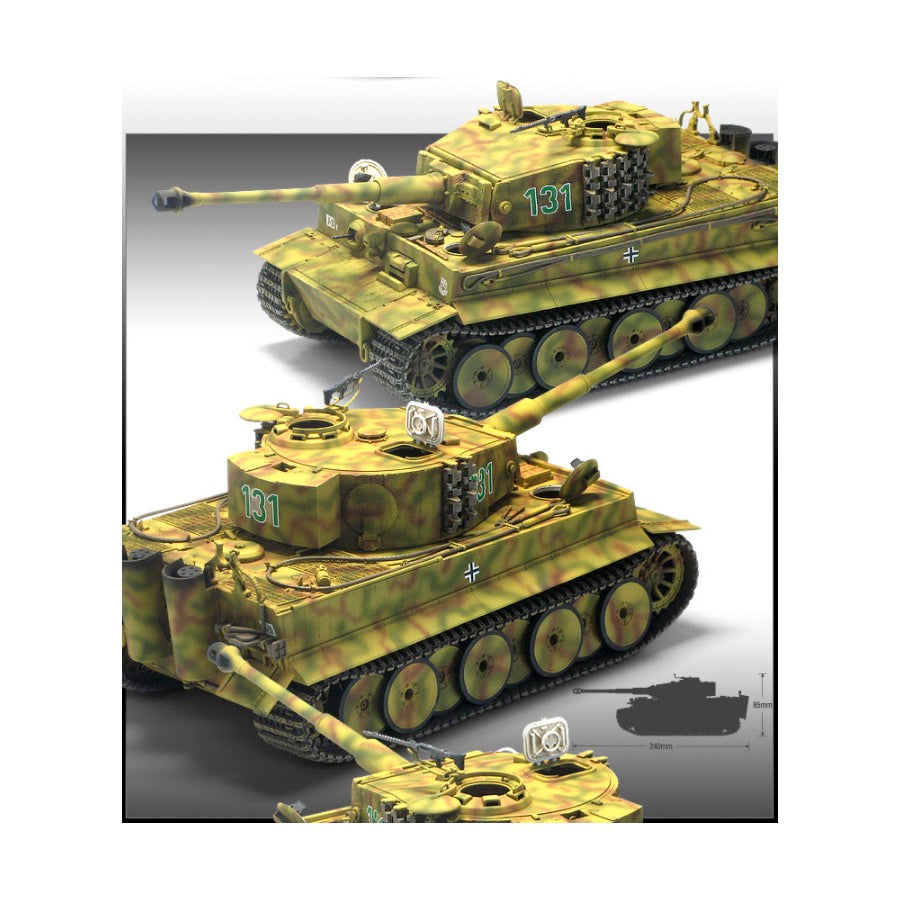This is a high quality kit from Academy of the Tiger-I (Ver. MID) in 1/35 scale. Features new tooling of asymmetry turret, mantel, 88mm canon, engine deck and accessory. Includes photo-etched engine grill and Zimmerit tool.
