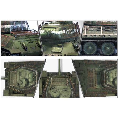 The T-34/85 played an active part in the later part of World War II. This precision-molded model kit represents a locally modified version of this tank, with a welded net, used during the Battle of Berlin. Decals and photo-etched parts are included.