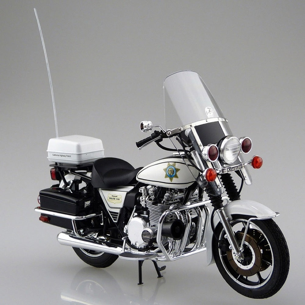 Aoshima's model kit of the 1982 Kawasaki KZ1000P Police 1000 reproduces the companion of many U.S. police officers! It can be built as a Los Angeles Police Department or San Francisco Police Department version, with different cowlings and windshields to choose from. The rubber tires feature a realistic texture, and vinyl pipes are included for the wires and hoses. This kit is made with a mold manufactured in the 1980s.