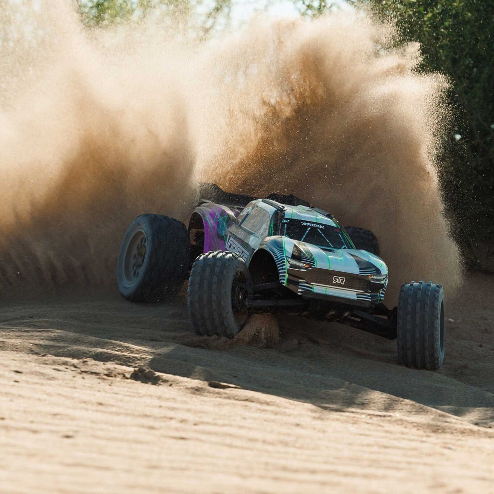 Proven ARRMA engineering gives the composite chassis the durability for bashing over punishing surfaces. The independent suspension, oil-filled shocks, and adjustable ride height combine to provide a smooth ride over uneven terrain. For unstoppable traction, the stadium truck's metal gear differential moves power from the installed MEGA 550 motor to the all-terrain rear tires.