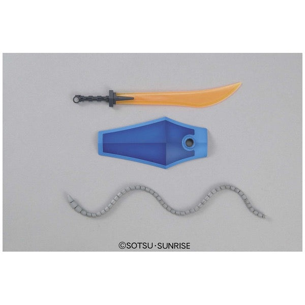 Its signature weaponry includes a shield, a Heat Saber, a Heat Rod, and a Finger Vulcan for its left hand. A regular manipulator left hand is also included to replace the Finger Vulcan if you so desire. Each section of the Heat Rod is ball-jointed so you can bend it into any shape you want! The blade part of the Heat Saber is made of clear orange, and the Mobile Suit's cockpit can slide open to reveal a sitting-pose pilot figure (molded in light blue). Also packed in the set are in-scale figures (molded in light blue) of Ramba Ral and his aide Crowley Hamon. A sheet of stickers and dry-transfer markings are included.