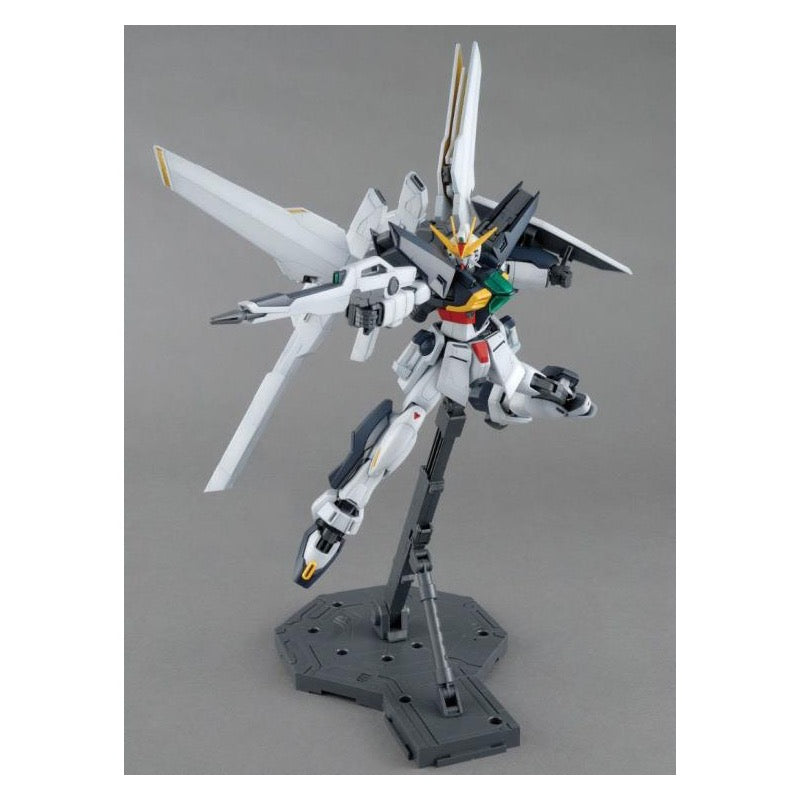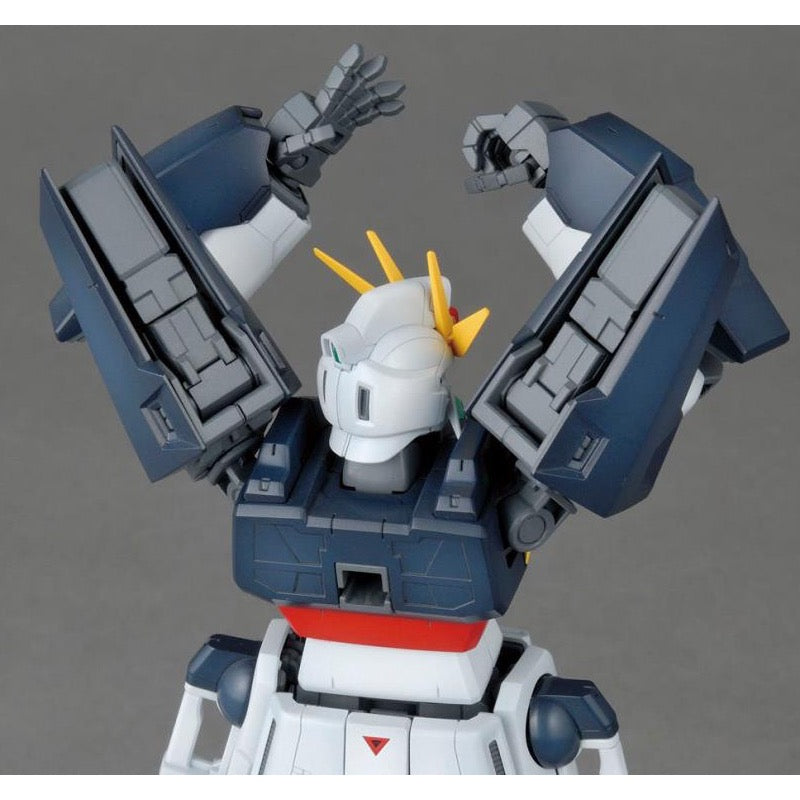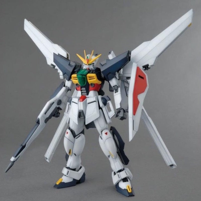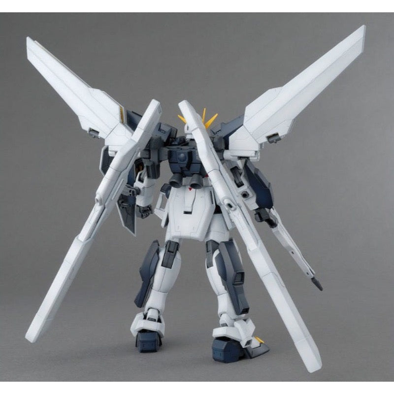 It has common parts between the internal frame and reflector units of the Gundam X. The Twin Satellite Cannons can be deployed with their reflector panels out, and the internal reflector panels have a mirrored frame similar to that of the Gundam X. The cannon can expand and change its angle for various attacks, and there's a locking mechanism on the shoulder for better stability. In addition, the forearms and calves also feature reflector expansion. Comes with its shield, Buster Rifle, two Twin Satellite Cannons, two Hyper Beam Swords, and in-scale figures of Garrod Ran and Tiffa Adill.