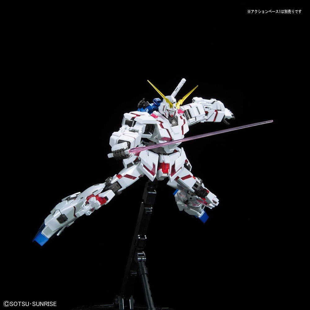 The titular mecha from the "Mobile Suit Gundam Unicorn" serial novel comes sharply molded on colored runners and is capable of being switched between Unicorn Mode and Destroy (NT-D) Mode. In Unicorn Mode, the all-white Mobile Suit has a horn projecting from its forehead that resembles that of the mythical creature for which it was named. When switching to NT-D Mode, its armor slides open to reveal its psychoframe, the four blades on the shield expand outwards, its unicorn horn opens, and a Gundam face is revealed. Its armaments include four Beam Sabers, a Beam Magnum, Hyper Bazooka, and a shield. Sheets of foil stickers, Gundam decals, and marking stickers are included.