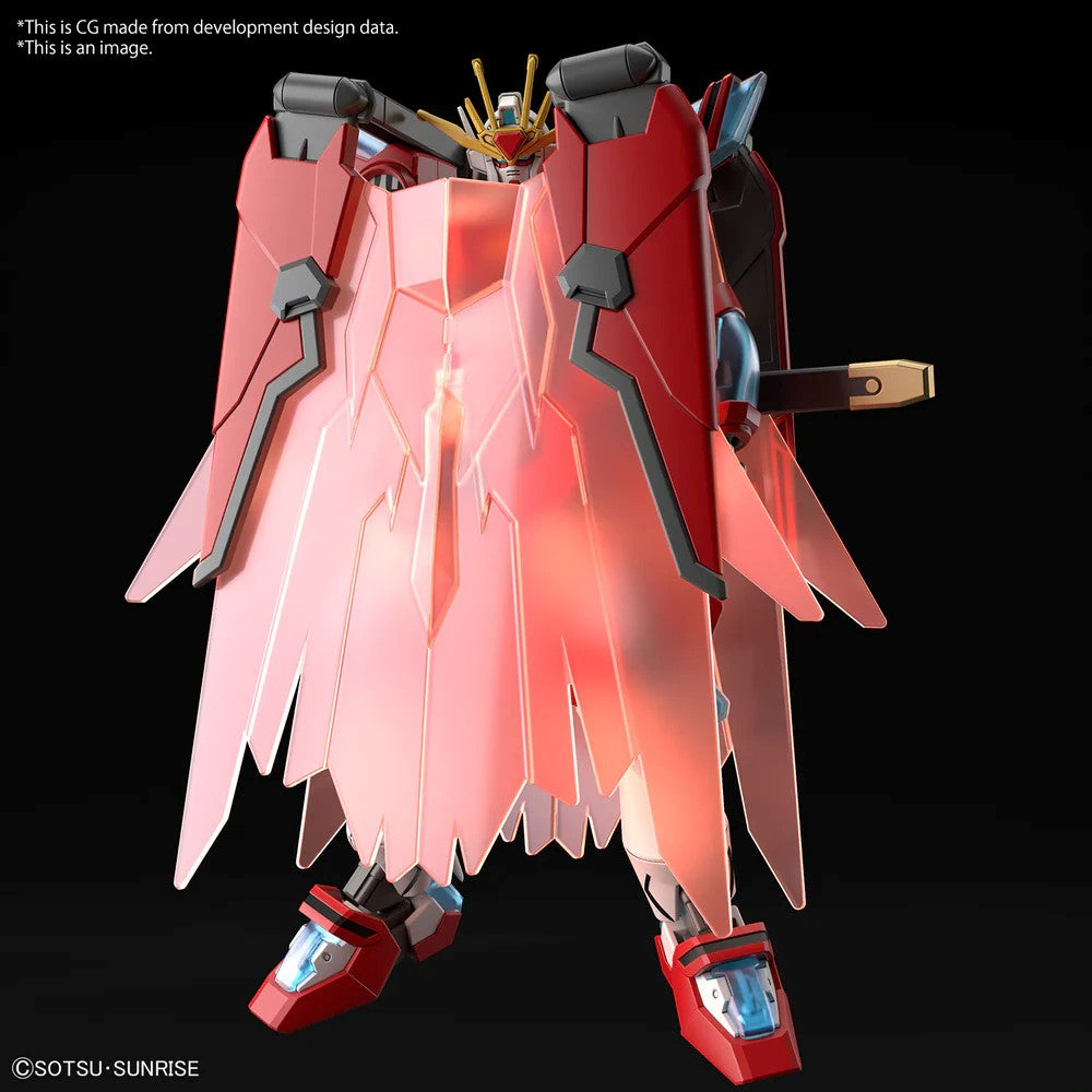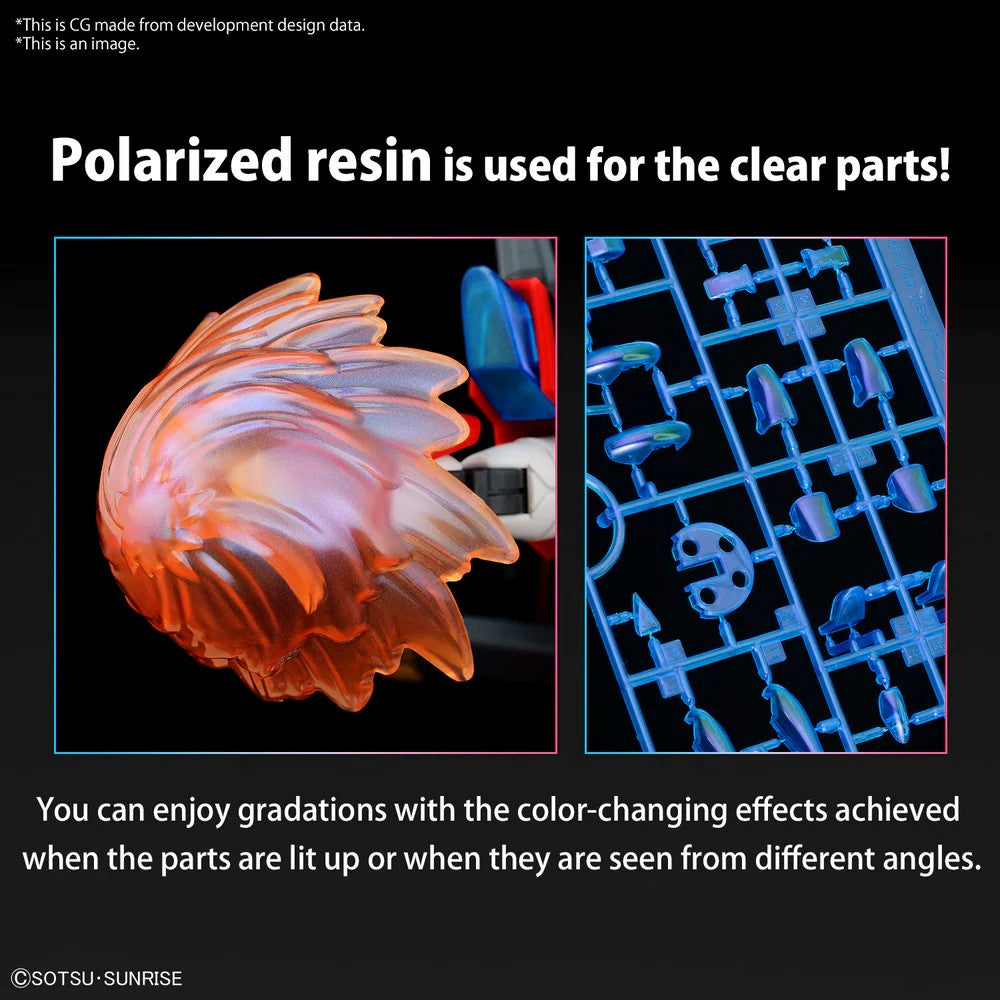 It comes with various effect parts, including cloak effects based on the Master Gundam. A polarized resin has been used for the clear parts, giving them a unique color-changing effect when viewed from different angles. This mighty mech comes with its sword, scabbard, and three sets of interchangeable hands.