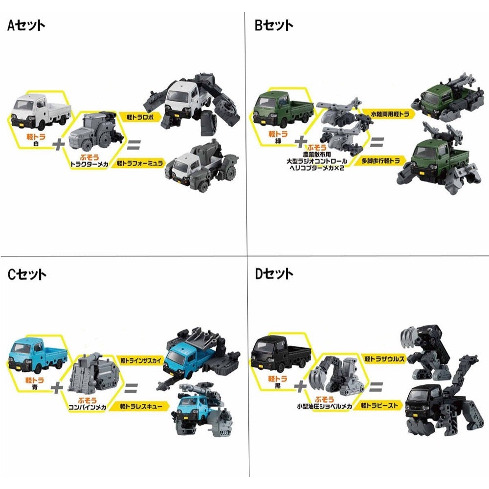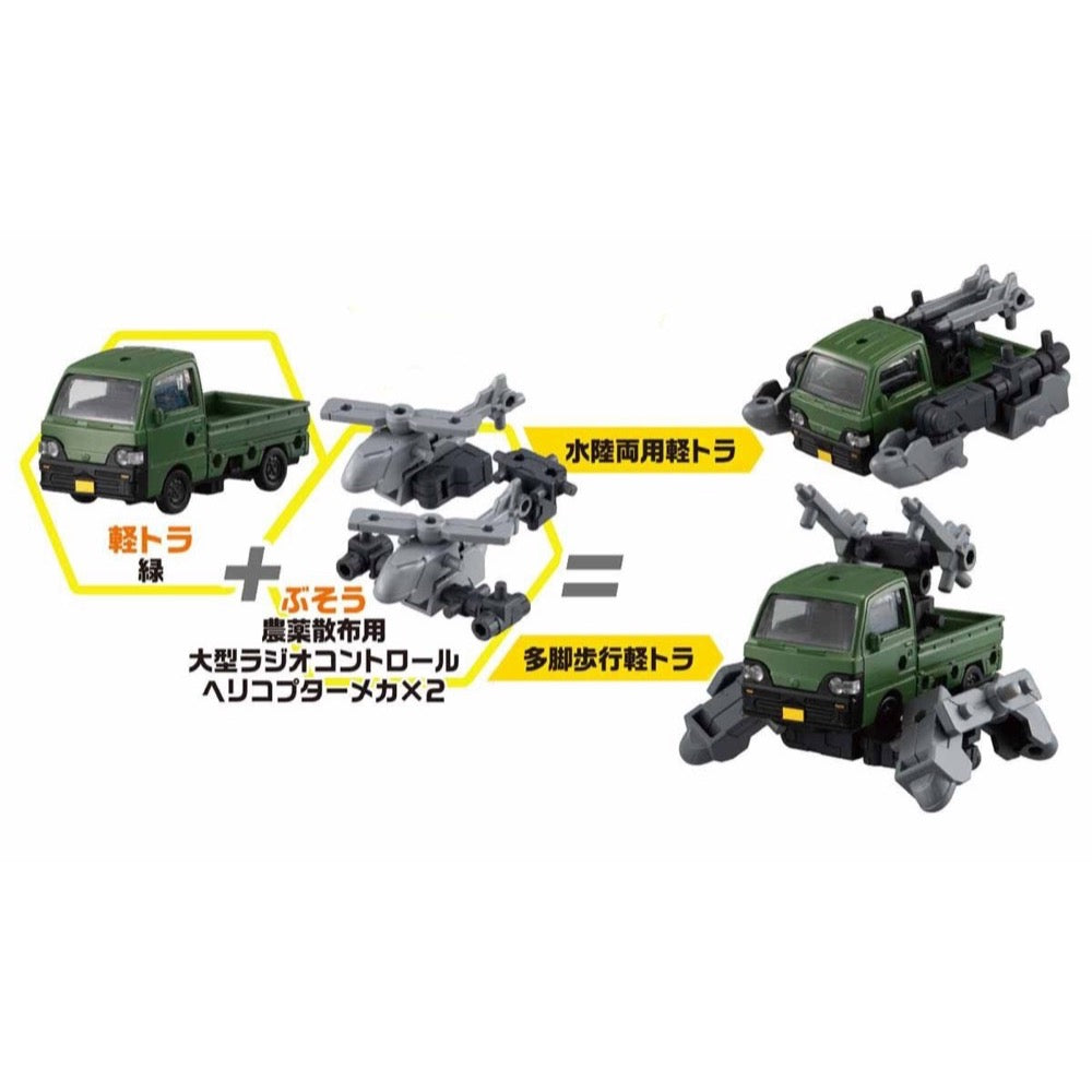 • Set B: a green truck with a large R/C-style helicopter mecha, and two parts to spray pesticides! It can be remodelled into an amphibious form and a multi-legged form.
