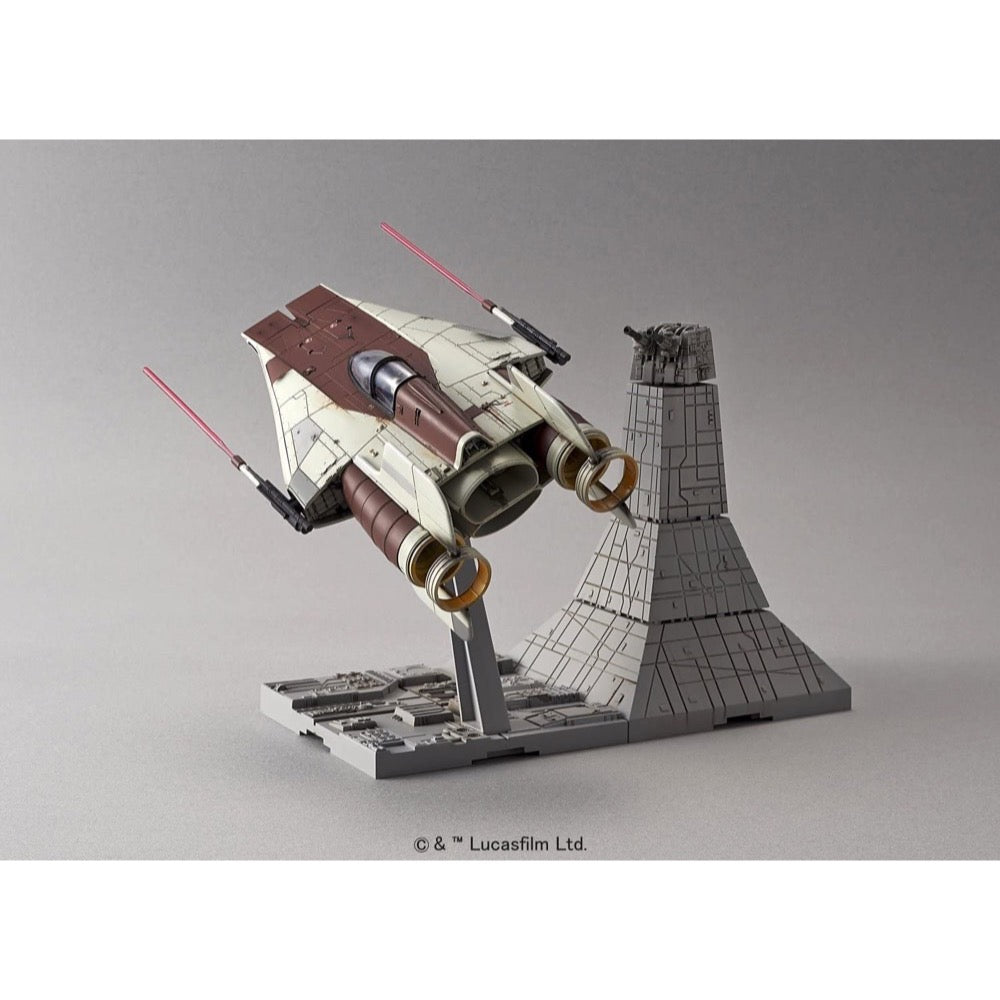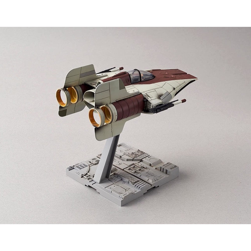 The A-Wing star fighter from the Star Wars universe has been faithfully recreated as a 1/72 scale model kit utilizing Bandai's patented four color injection process that allows for construction of highly detailed parts that are color molded reducing the need for paint.