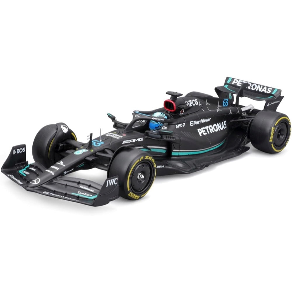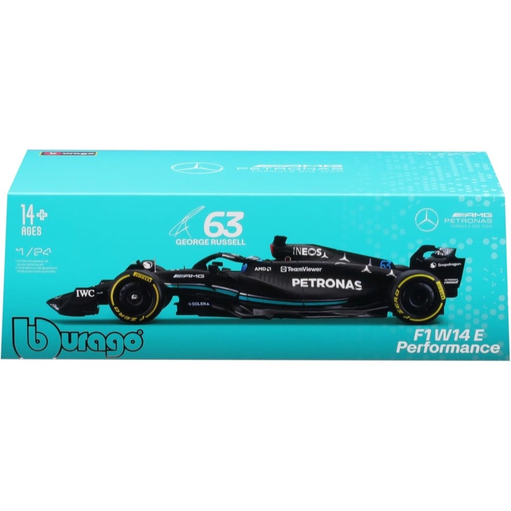 The Mercedes-AMG F1 W14 E Performance #63 F1 2023 George Russell is a must-have for fans of the talented driver. With its accurate body profile, realistic livery, and hand-fitted plastic parts, this 1:24 scale model is perfect for display. The electrostatic paint finish, cockpit detail, and soft feel tyres add to its authenticity, while the free-rolling wheels make it easy to showcase. The included acrylic display case and full-color matt card sleeve provide a professional touch. Expertly crafted by Bburago, this mid-range adult collectible is a true representation of the top-performing Mercedes-AMG F1 car.