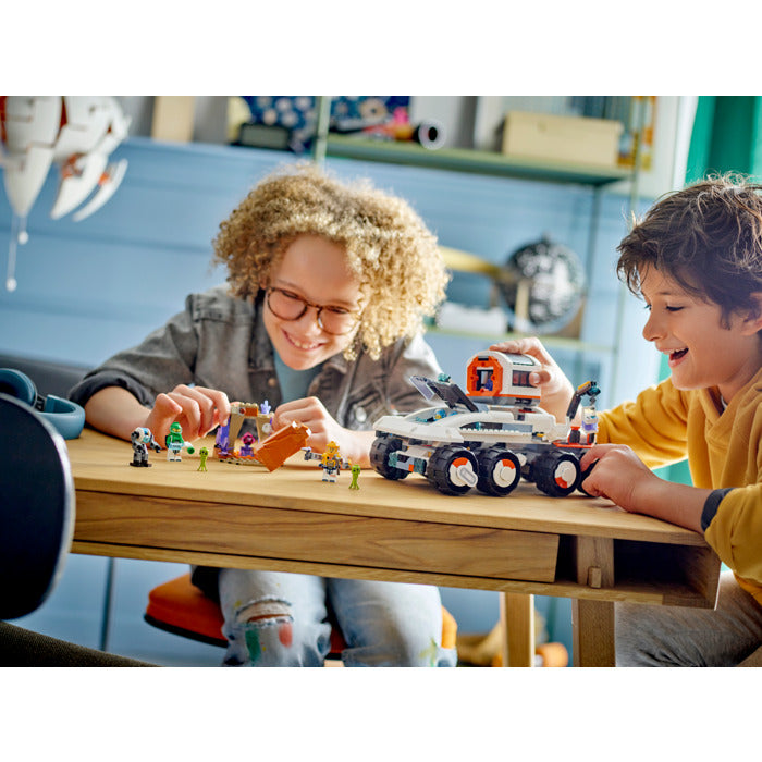 Set the stage for planetary exploration with the LEGO® City Command Rover and Crane Loader (60432) outer space toy for ages 7+. This futuristic 8-wheeled vehicle has everything kids need for exploring distant planets, including big tires, sample storage hatches, a crane arm and a pod bay for docking the air-lock laboratory. The playset also includes a planet scene where explorers can discover alien plants and an energy crystal. Just add the 4 space crew minifigures and robot and alien action figures for epic space adventures.