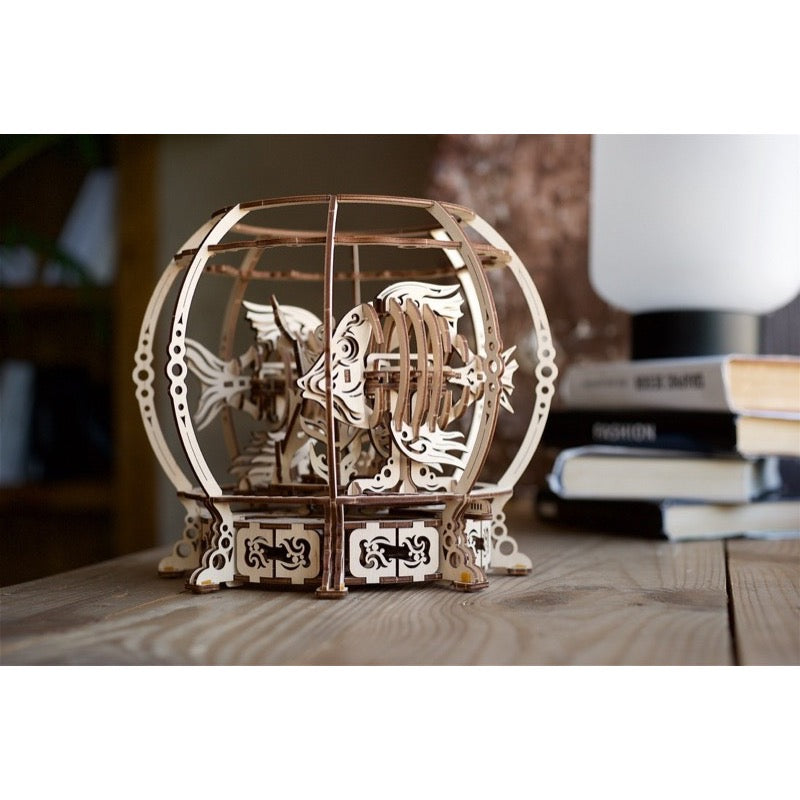 Not everyone is up to the challenges or expense of setting up and maintaining a saltwater fish tank. Even a basic starter tank for beginners represents a substantial, ongoing investment of time and resources. But with the Ugears Mechanical Aquarium, you can dip into the fascinating underwater world with an attractive, whimsical wooden model you can build yourself, then proudly display. Once the model is assembled your family and friends will have hours of enjoyment watching the automaton fish swimming with lifelike action around their wooden bowl, while getting occasional peeks through the fronds at the secretive seahorse. And you'll never need to test or change the water!