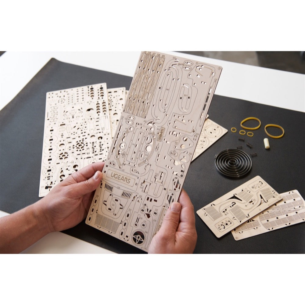 The Pickup Lumberjack has 3 modes: R (Reverse), N (Neutral), D (Forward). The spring's energy is transferred to a gear set to increase the gear ratio, through the gearbox, then to the drive shaft, differential, and rear axle. A Start/Stop mechanism located in the truck bed allows you to start the truck on command. Because this is Ugears, and because we love to focus on the small, whimsical details that make a model exceptional, a small pendulum under the seats simulates the shaking of a truck's powerful engine. Bent plywood gives the model beautiful lines and 1950's styling. The Pickup's doors open from inside and outside, and the tailgate folds down. The front wheels can be turned using the steering wheel and locked in place for graceful turns. The Pickup Lumberjack also features front and rear spring suspension so you don't get bounced around too much on those country roads.
