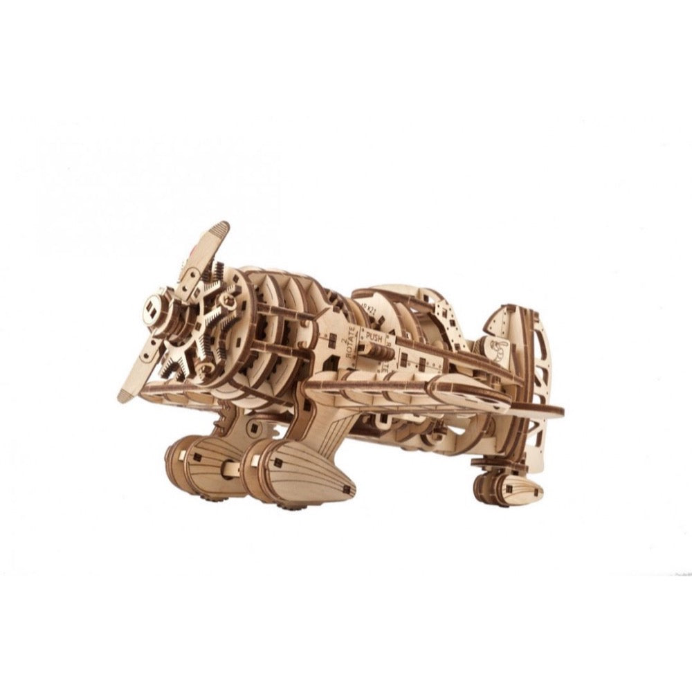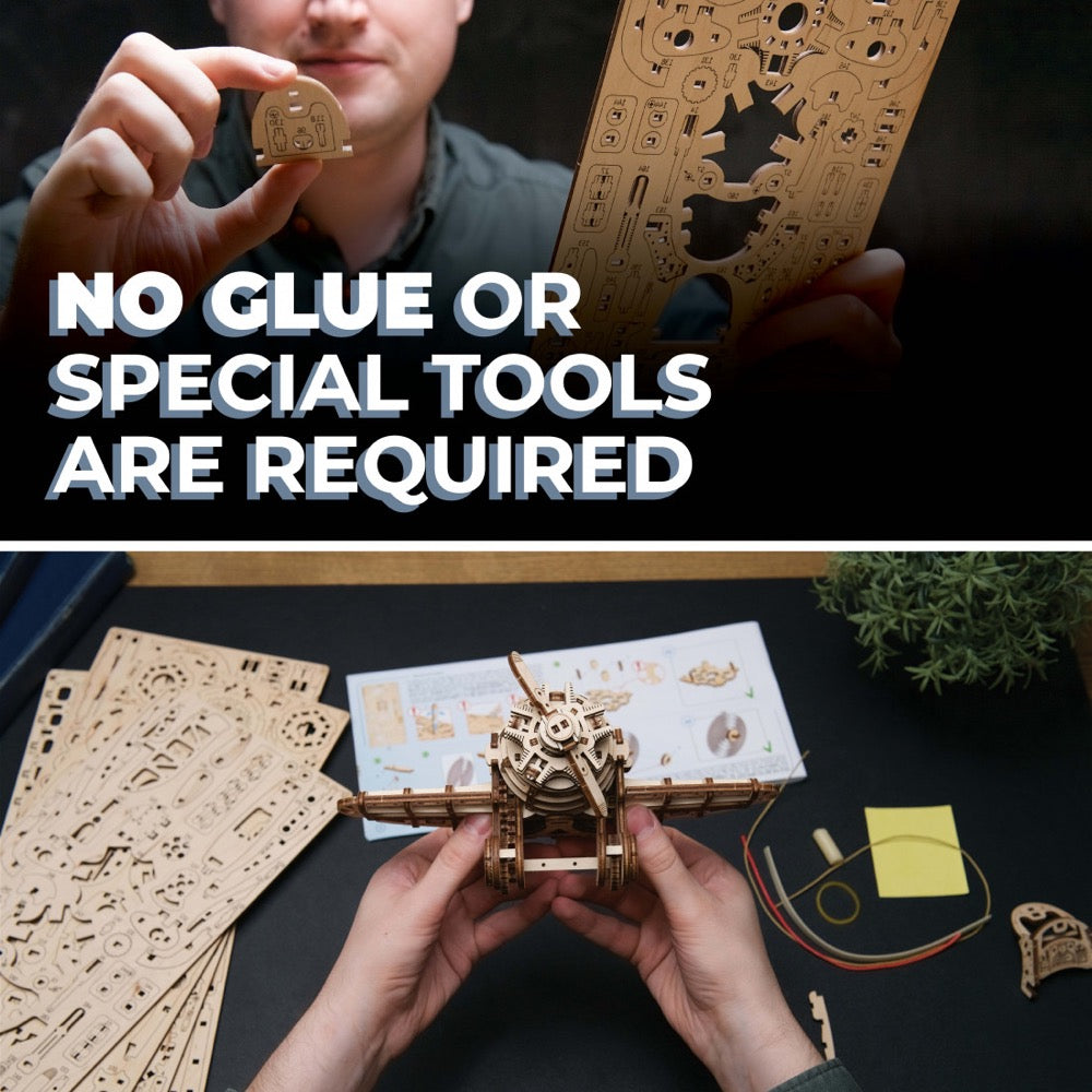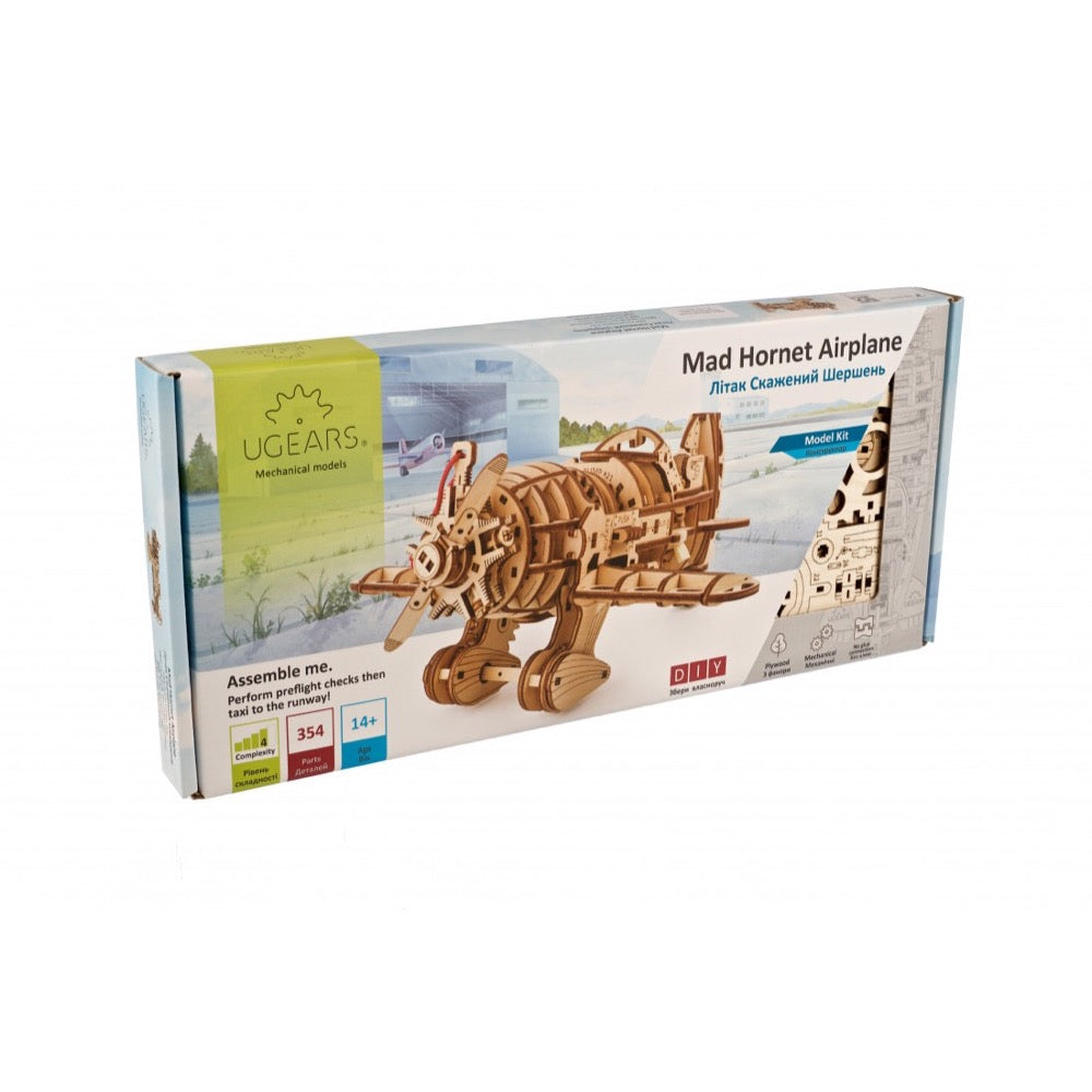 No glue or special tools are required to assemble this DIY model kit, just punch the pre-cut pieces out of their composite wood boards and snap them together. When assembling your Mad Hornet Airplane model, remember to lightly sand and wax the moving parts to make them run smoothly. This is a "Medium" difficulty model so meant for somewhat experienced modelers or those up for a challenge. The model kit includes detailed, illustrated instructions in 11 languages (Ukrainian, English, German, Spanish, French, Italian, Portuguese, Polish, Japanese, Chinese, and Korean) to guide your assembly. If you're not yet familiar with the Ugears catalogue of 3D puzzles, DIY model kits, automatons, robots, wooden puzzle boxes and STEM Lab models you could order one of our simpler models together with the Mad Hornet as a warm-up build.