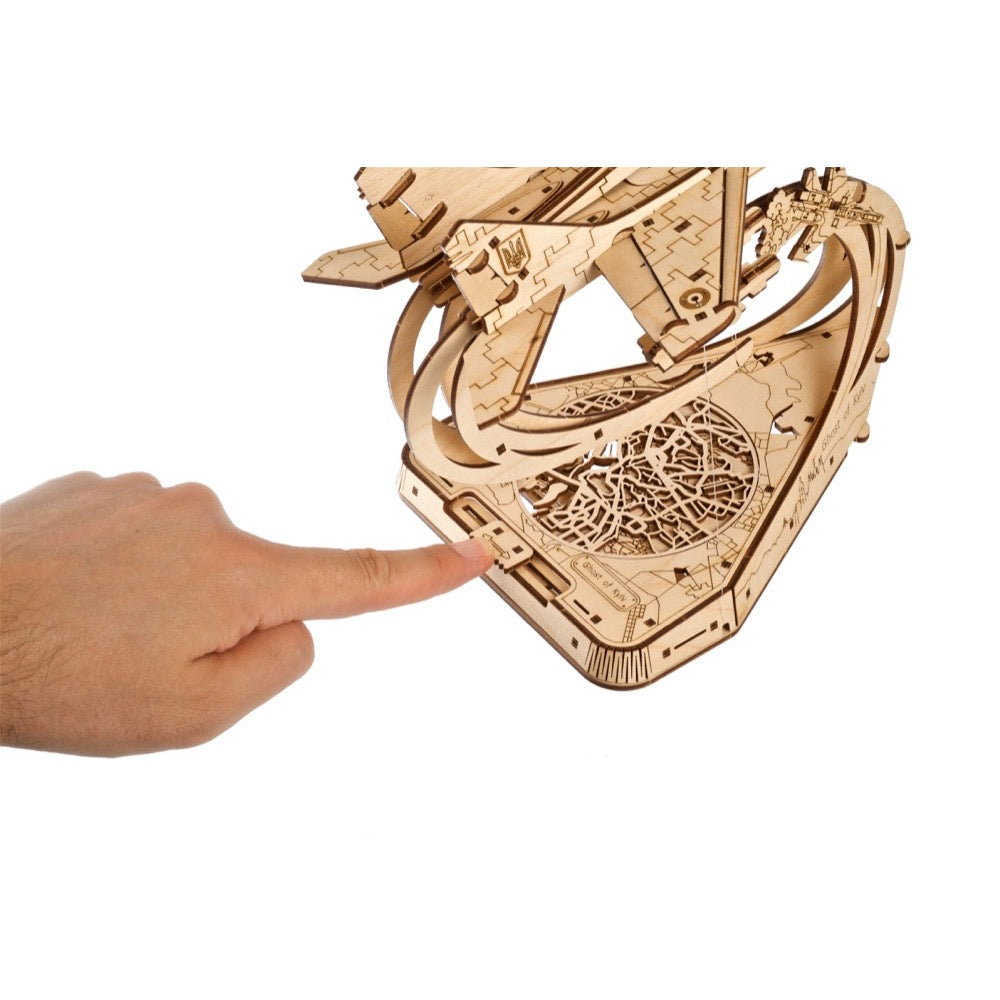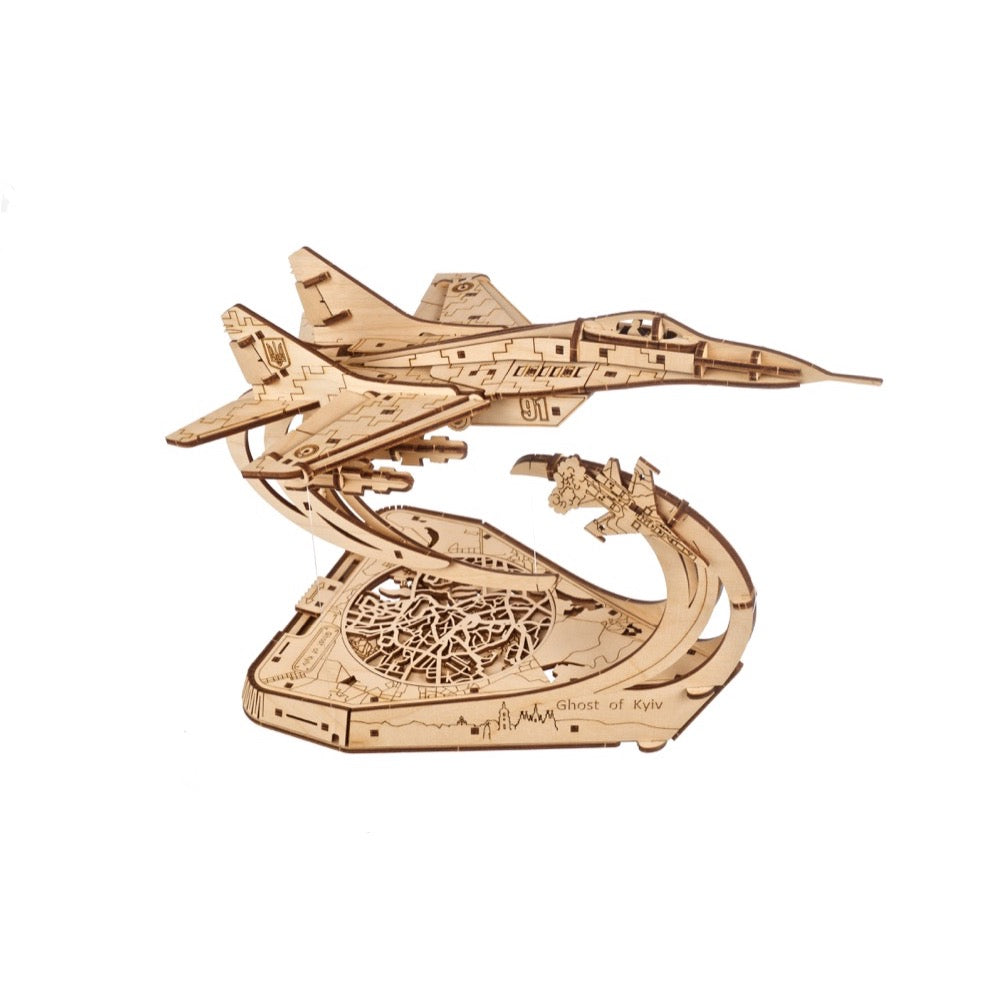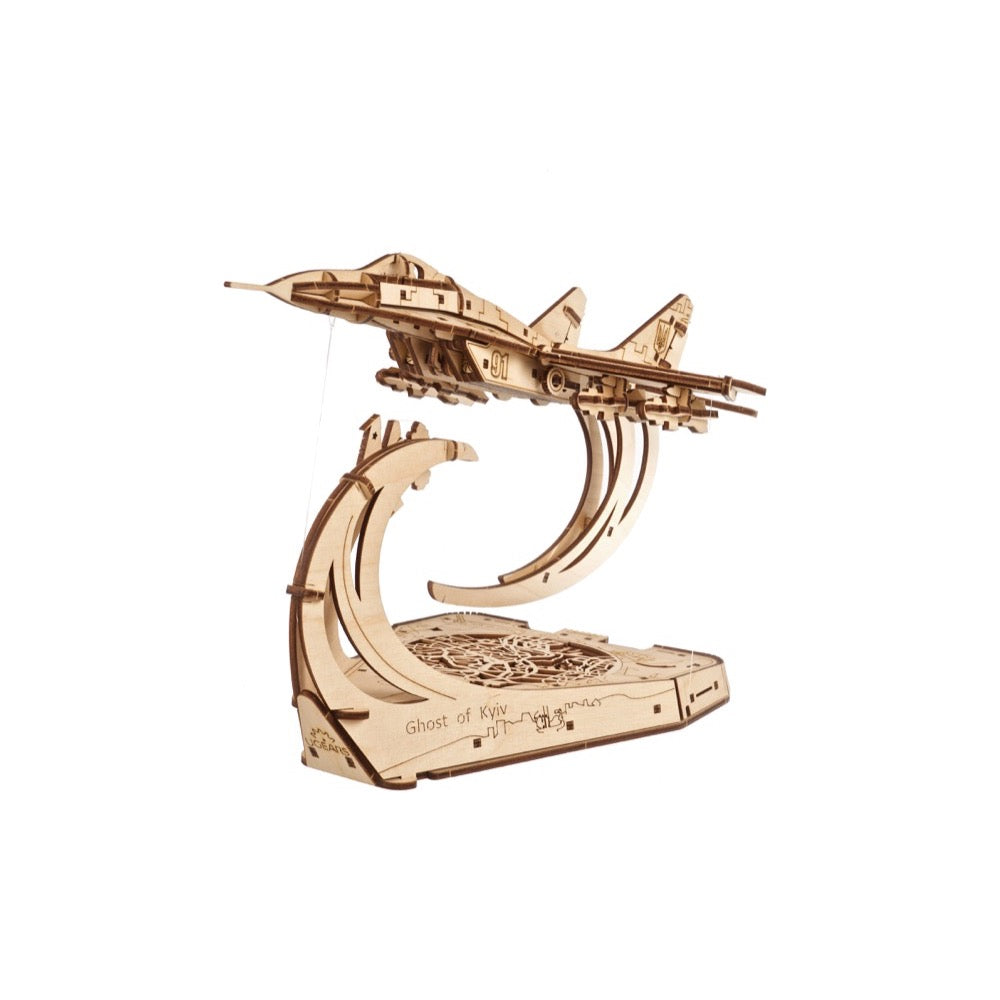 The stand over which The Ghost of Kyiv seemingly levitates tells a story. The base of the stand features an attractive wooden cutout stylized map of Kyiv, symbolizing the city and all her inhabitants under the Ghost's protection. The sides of the base feature a panoramic view of the Kyiv skyline. The arm of the stand displays a downed enemy aircraft—add one more to the Ghost's tally! This wooden model MiG-29 is a companion piece or "big brother" to The Ghost of Kyiv Attacks, a smaller, simpler "mechanical stories" model from Ugears' Age of Bravery series, celebrating Ukrainian defenders throughout history and highlighting some of the standout episodes and stories of the current war. Collect them all!