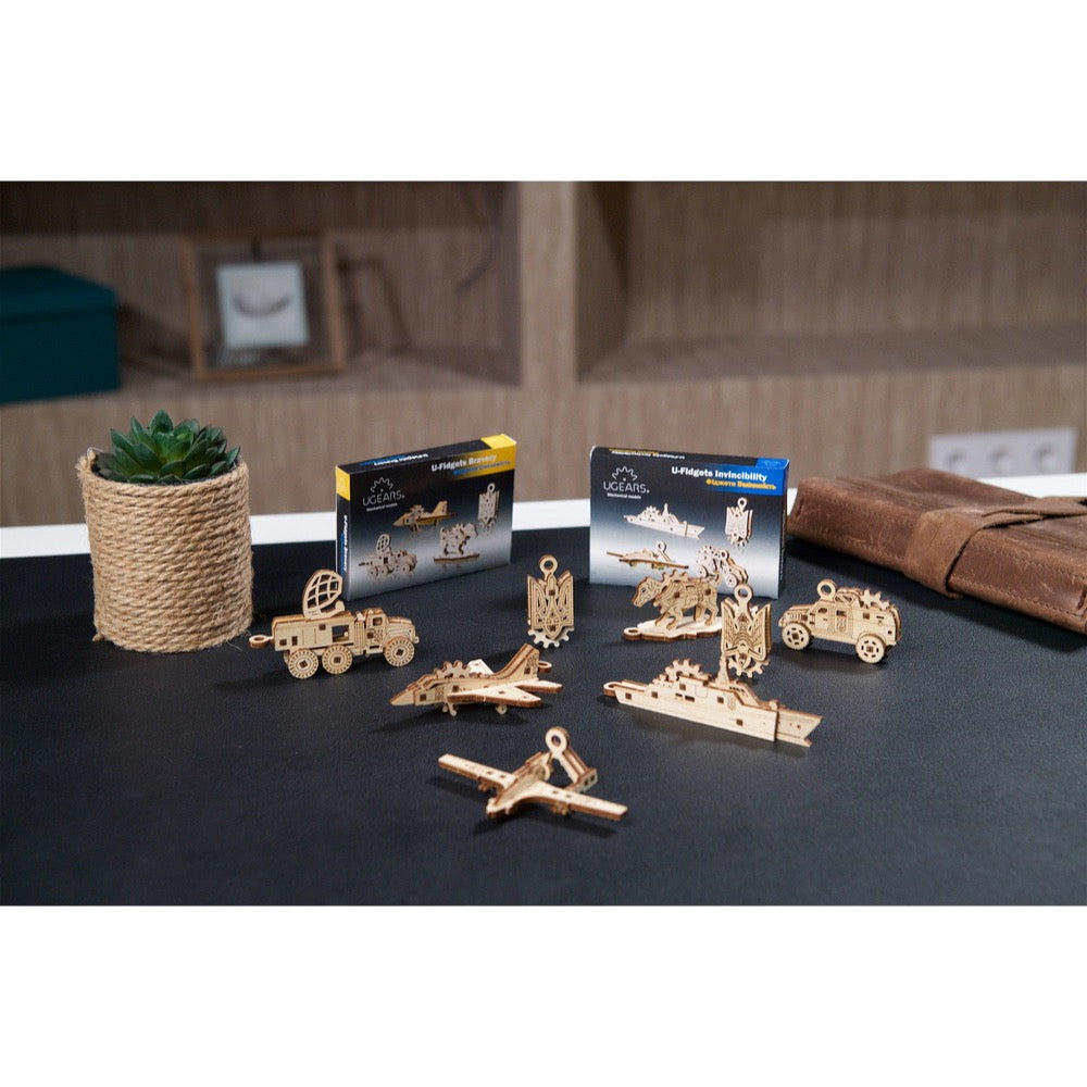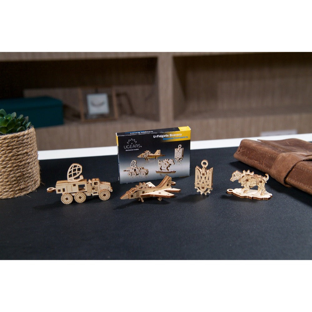 The "Bravery" series of U-Fidgets from Ugears celebrates some of the heroes bravely defending Ukraine against the invader. The set features four small wooden figurines you assemble yourself, each with simple mechanical elements: