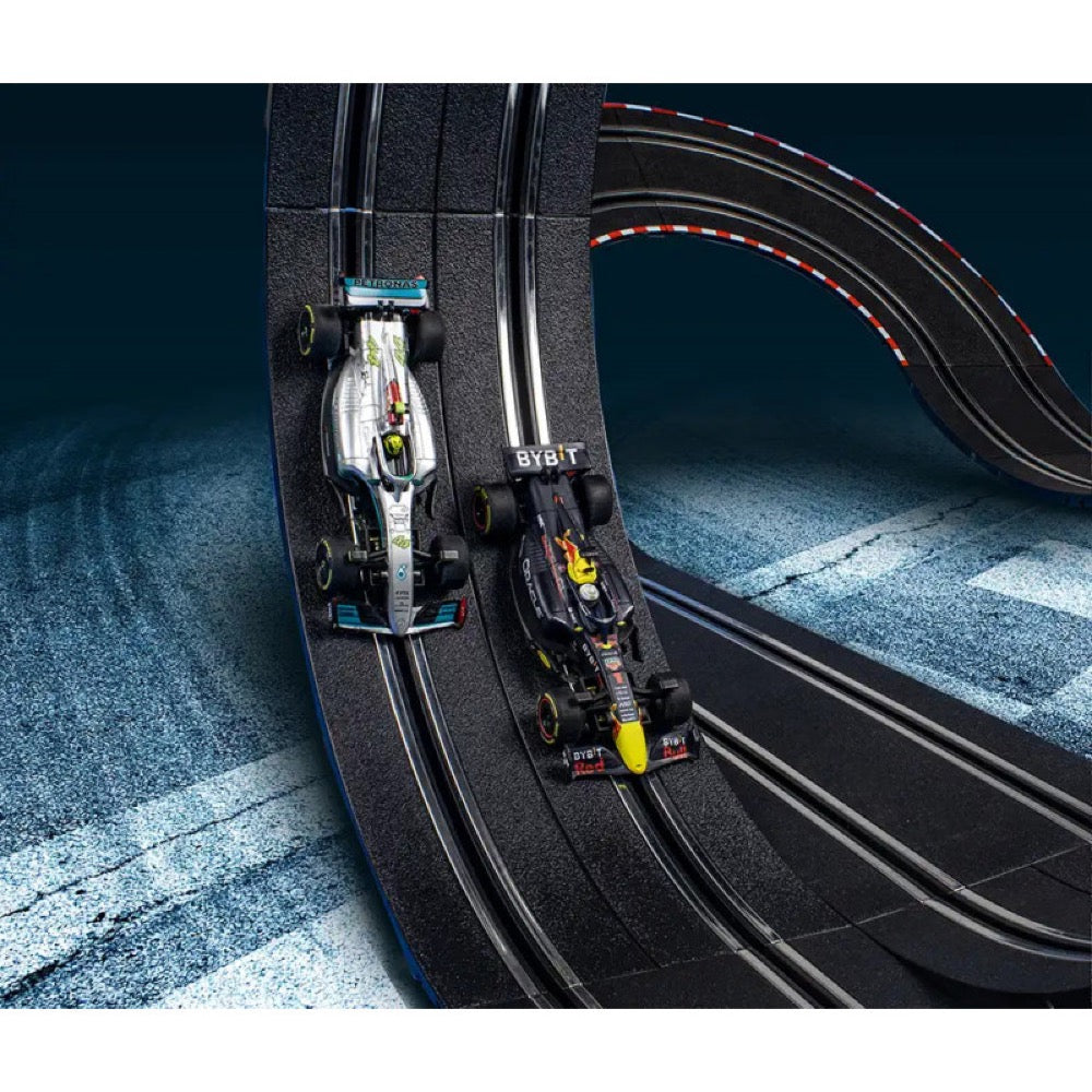 This is a small-scale battle re-enactment between the key rivals for the 2021 F1 world championship. The Carrera GO!!! 'Max Performance' set allows you and your friends to rerun the thrilling Formula 1 dogfights between Max Verstappen and Lewis Hamilton at any time.