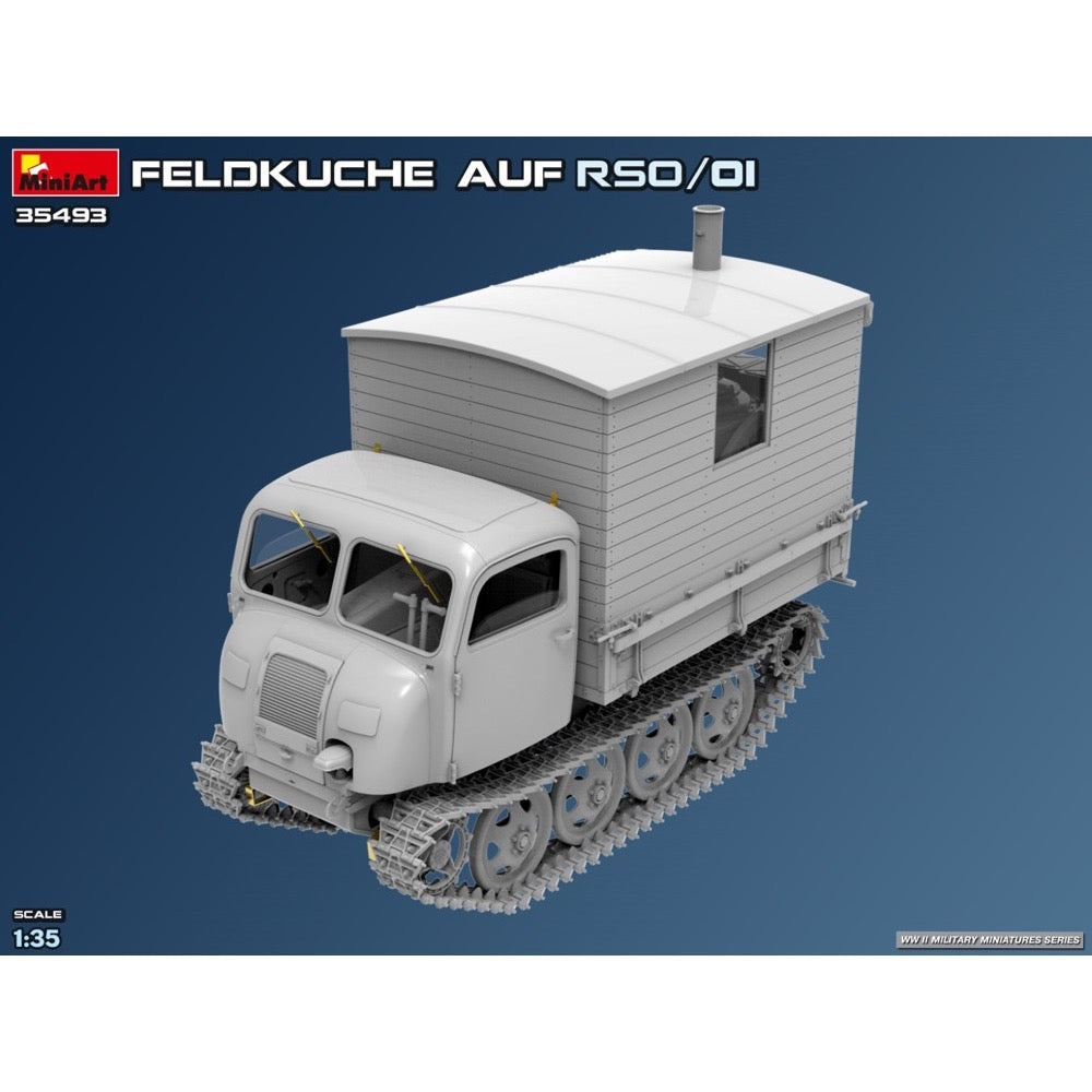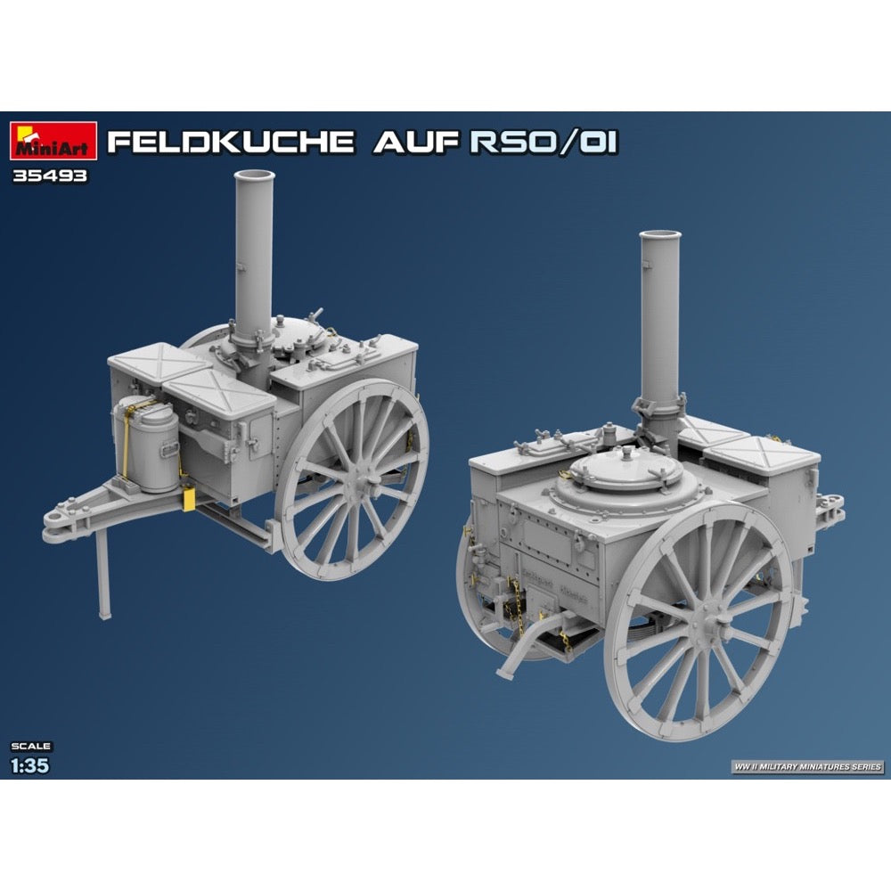 This 1:35 scale plastic model kit accurately recreates the WWII German field kitchen mounted on an RSO tracked vehicle. The kit captures all the functional details of this mobile kitchen unit, an important component of Wehrmacht logistics. The RSO’s design – with its simple angular shapes and exposed mechanical components – contrasts with the more complex field kitchen structure, offering an interesting experience for Modelers.