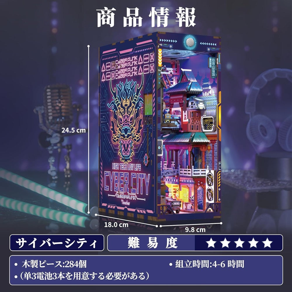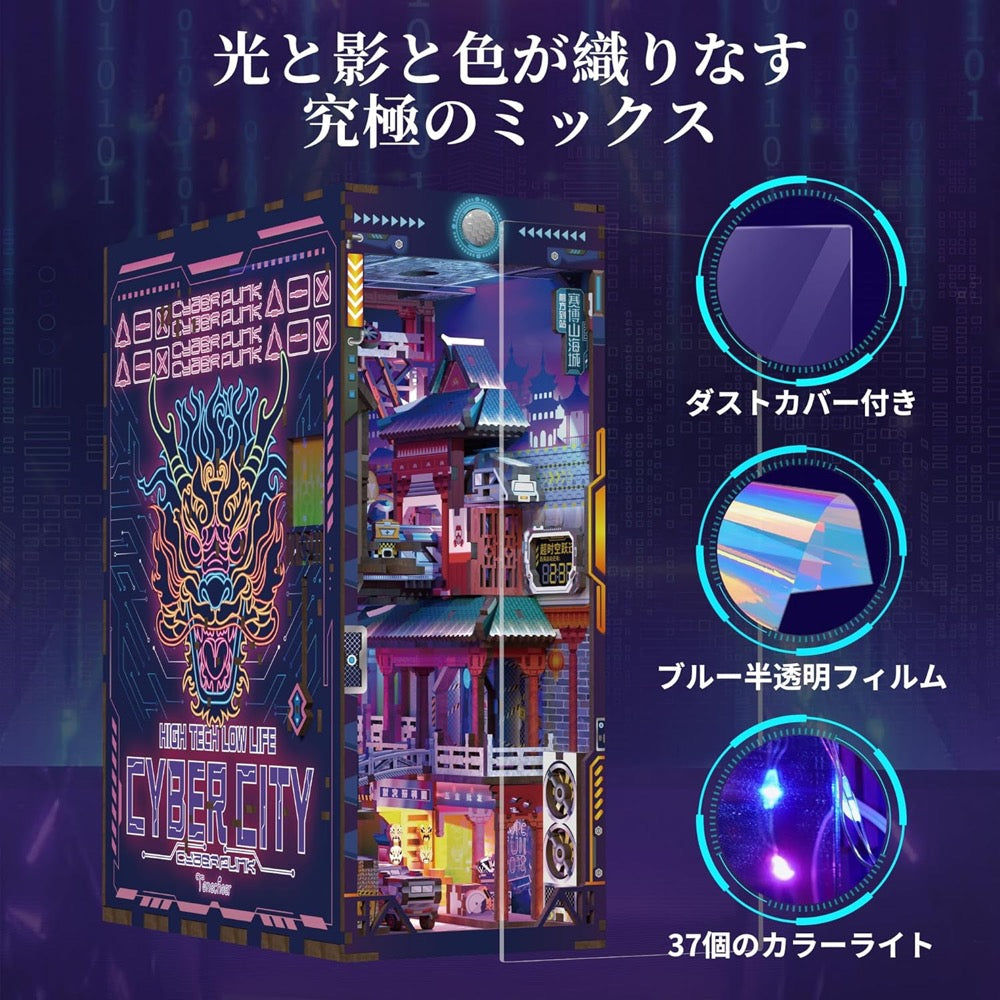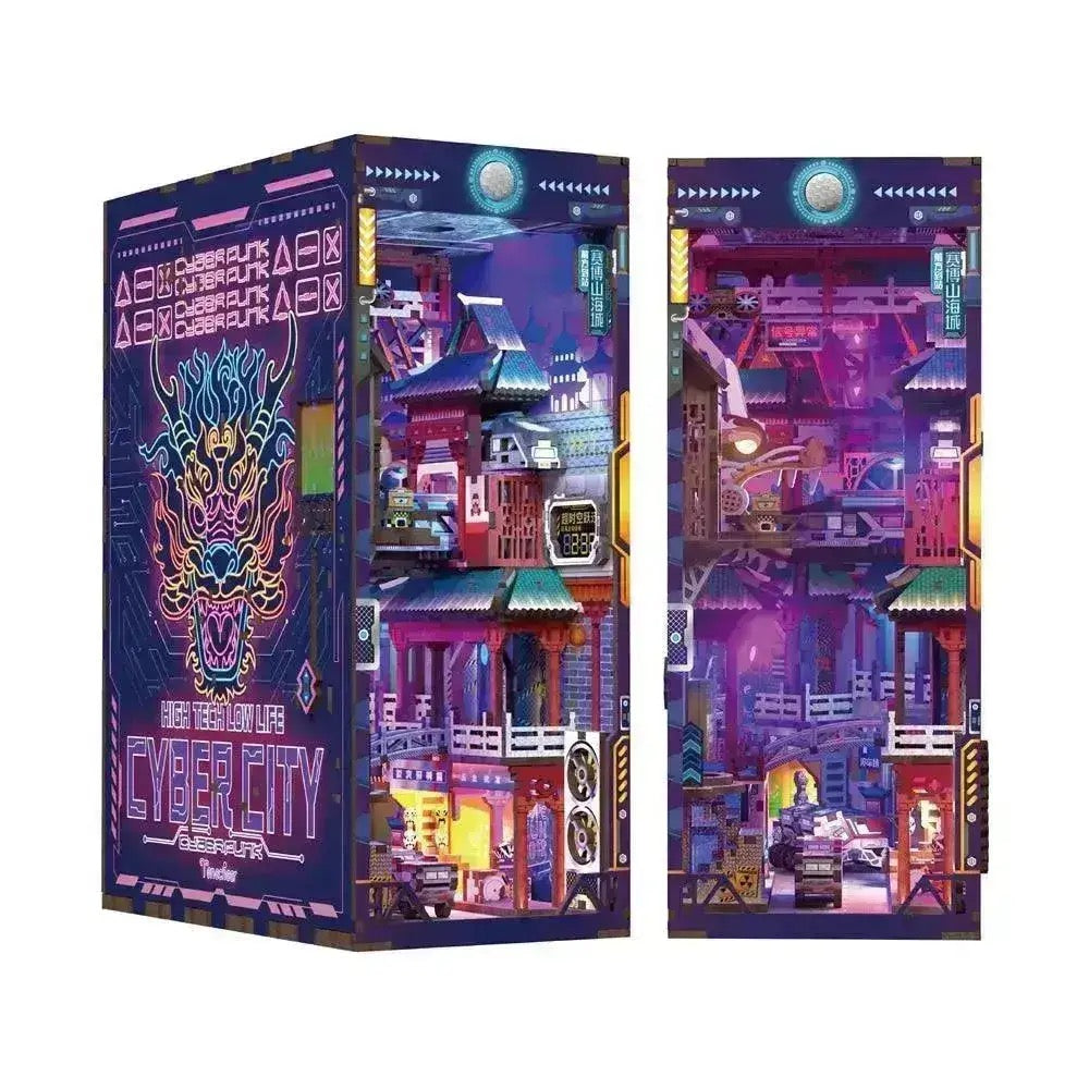 Turn your bookshelf into a futuristic metropolis with the Cyber City DIY Book Nook Kit. This intricate, practical project captures the vibrant energy of a neon-lit cityscape, providing a detailed miniature world full of dazzling detail. Perfect for sci-fi and cyberpunk fans, this book corner brings the electrifying atmosphere of a bustling cyber city right into your home.