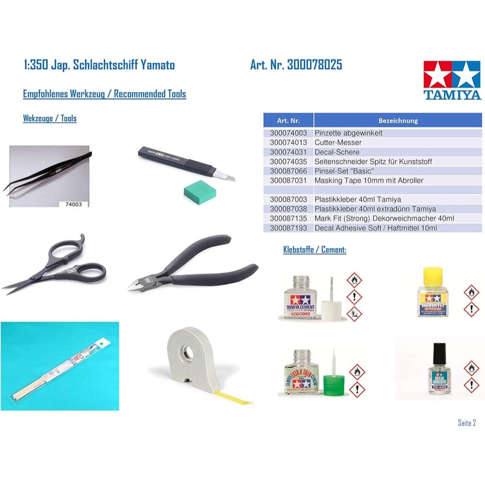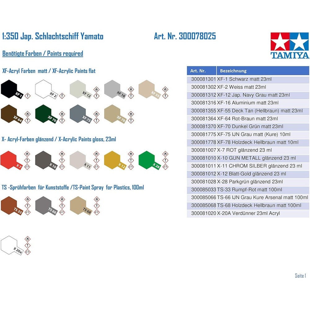 Based on the latest historical research, this famous WWII battleship has been reproduced down to the finest detail in this 752mm long 1/350 scale model kit. Even parts which had not been seen before in model form, such as the turret barbettes, have been reproduced as Tamiya challenges conventional ship model standards. This model accurately depicts the Yamato with increased anti-aircraft armament as she appeared on her final mission to Okinawa and may be assembled for either full-hull or waterline display. Two sheets of photo-etched parts for details such as ladders and cranes are also included. With this level of engineering, accuracy, and detail, this is literally Tamiya's new flagship model.
