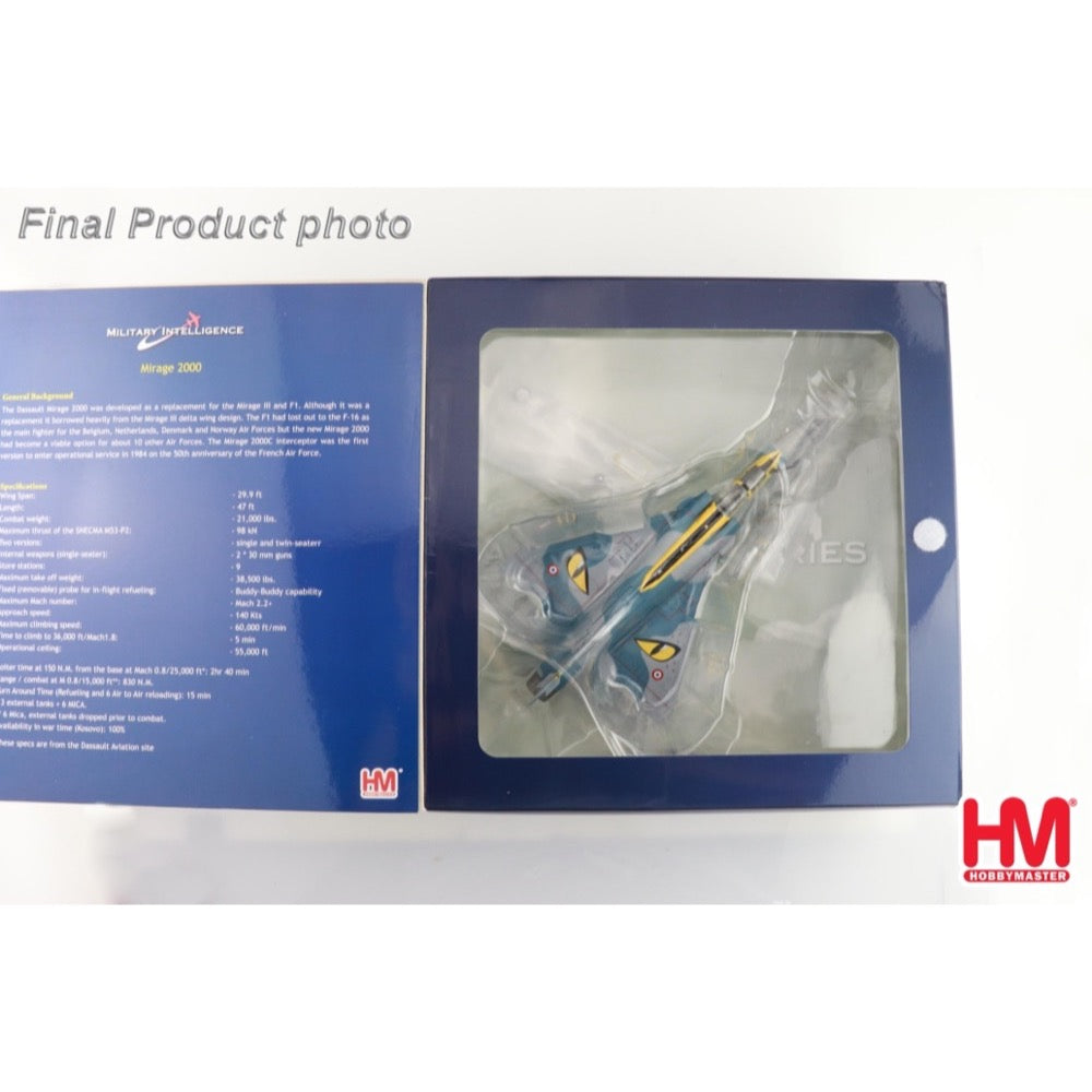 Service for the Mirage 2000 began in 1984, and the last production aircraft was procured by the Hellenic Air Force in 2007. The Mirage 2000-5F was intended to be an export version, but the French Air Force did not receive enough interest to make it feasible, so existing aircraft were modified. In 1993, it was agreed to update the present aircraft, and work began in 1997, with its first delivery of 2000-5F in 2000. The French Air Force frequently participates in the multi-national air defense drill (NOMAD) inspired by the Belgian Air Force, an annual event at RAF Waddington. The first NOMAD exercise occurred in 1994, in which European Air Forces and non-European Air Forces with squadrons based in Europe participated. France also sent Mirages to participate in 2002's RAF Waddington Airshow, just as they did in other years. The RAF Waddington Airshow is considered by many the greatest in the UK. This die-cast model faithfully recreates the Mirage 2000-5, No. 188-EF, celebrating 100 Years of the SPA 88 Squadron, EC3/11 "Corse" 2017. The 1/72 scale die-cast is 19.68cm long and has a wingspan of 12.7cm.