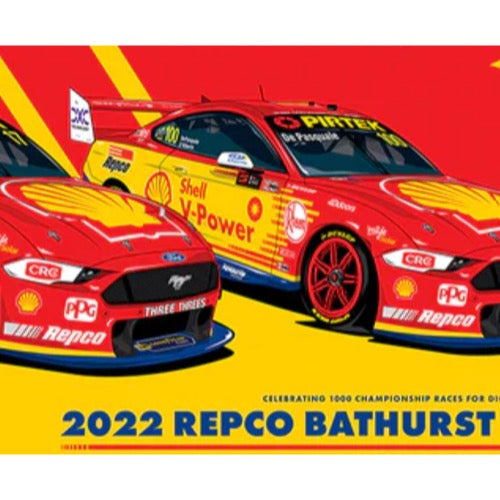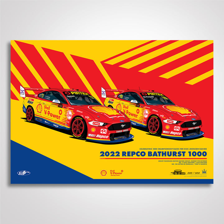 Featuring the artwork of Australian designer / illustrator Tristan Groves (who designed the modern interpretation of this livery to celebrate 1000 races for DJR), this impressive vector illustrated print features both the #17 and #100 Shell V-Power Racing Team Ford Mustang GT’s being raced by Will Davison / Alex Davison and Anton De Pasquale / Tony D’Alberto at the 2022 Repco Bathurst 1000 to celebrate this milestone achievement for the team.