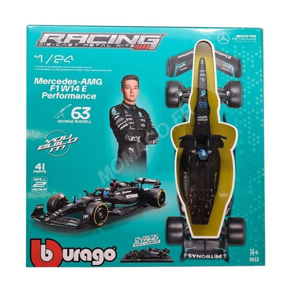 This detailed 1:24 scale kit brings the racing action right to your home. Based on the #63 George Russell Mercedes AMG W14E, the model features a high-quality die-cast metal body and finely crafted plastic parts.