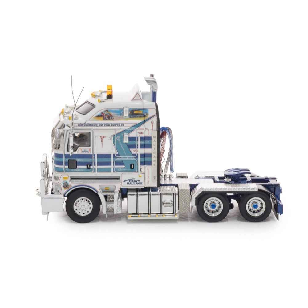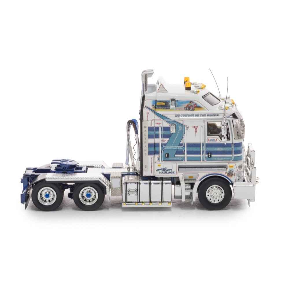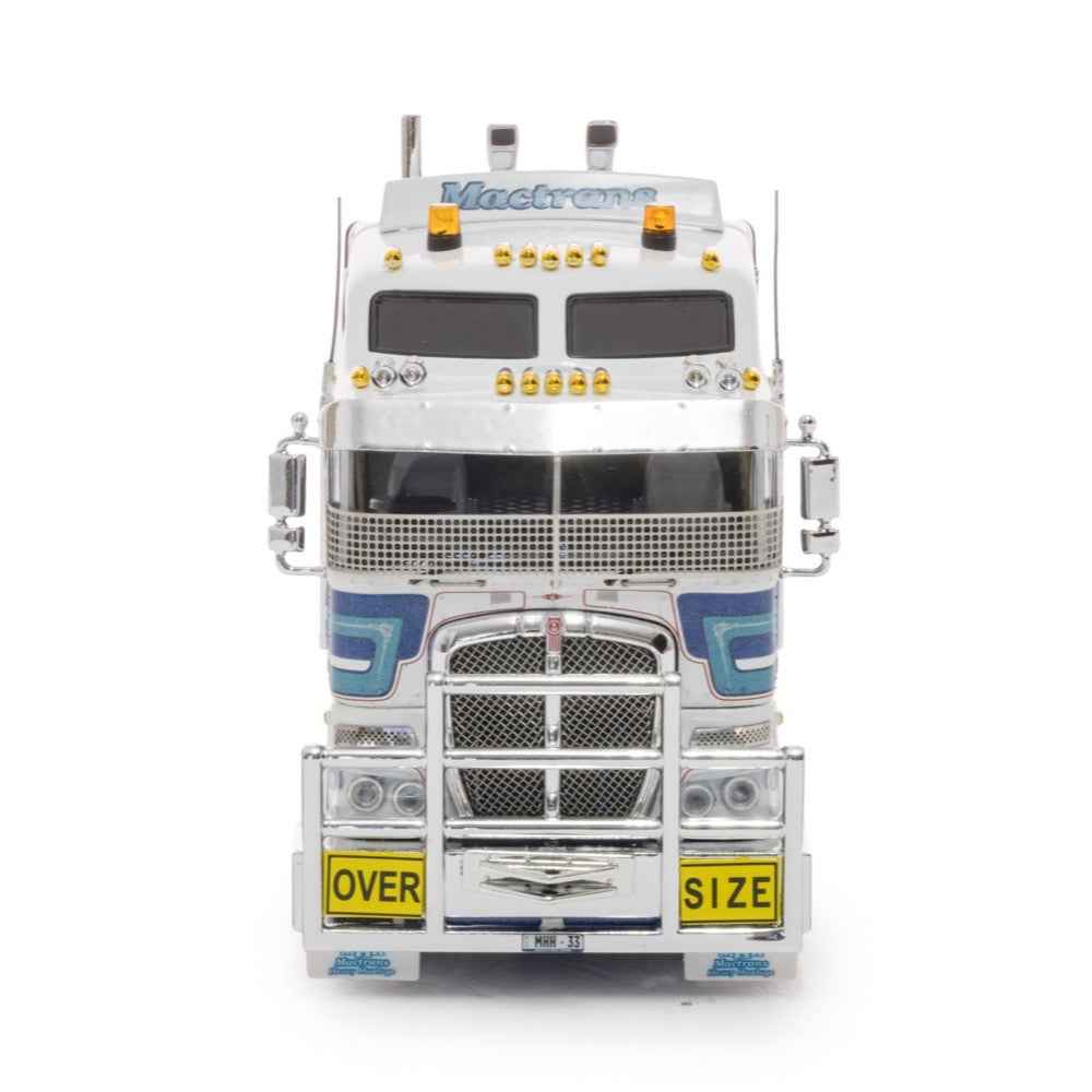 • Die-cast metal cab and chassis: faithfully replicates the Kenworth K200 2.8m cabin in Mactrans “Outcast” livery with precision detailing.