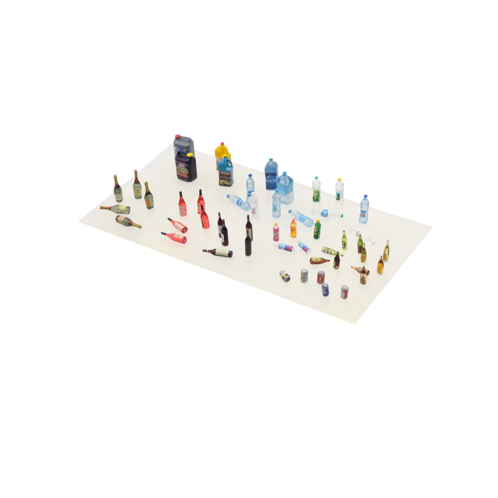 Included are 6 pieces of each of the small and medium bottles and cans, and 2 pieces of each of the large canisters, making up a total of 60 elements which should be enough for detailing several models or dioramas.