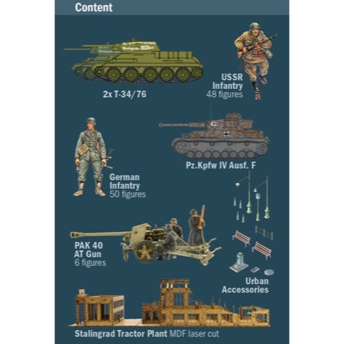 The battle of Stalingrad was a turning point of the Second World War and one of the most famous battle of the military history. The battle begun on summer 1942 and the Soviet Red Army faced the German army for the control of Volga and Don rivers region. The military operations were focused in the symbolic city of Stalingrad destroyed by the intense German bombing. The ruins of the city became the theater of brutal and fierce close quarters combats. One of the most important German target was the control of the industrial area including the huge tractor factory, converted during the war to the production of T-34 tanks, destroyed by bombers and artillery fire. On November 1942, the Soviets launched the large flanking maneuver to surround the Wehrmacht forces in Stalingrad that ended with the surrender of German Troops in the first months of 1943. The victory obtained by Red Army was the starting point of Soviets offensive that brought them to Berlin in 1945.