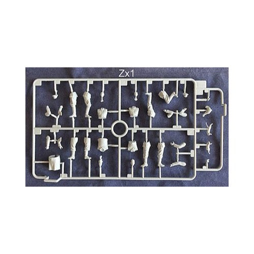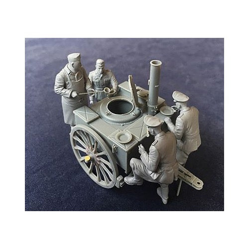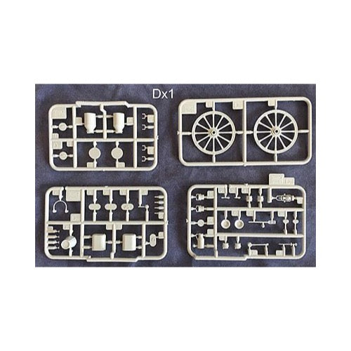This kit includes parts to build the field kitchen, three soldiers taking a lunch break, a very well-fed cook, and a grazing horse also on his lunch hour. Also includes food containers and a cat getting into one of them. Photo-etch parts are included!