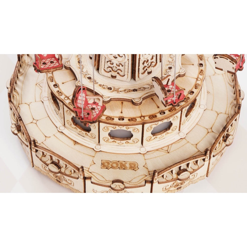 Robotime-ROKR Swing Ride DIY music box is a creative and fun-to-play wooden 3D puzzle kit of Magic Amusement Park Series. Its design is inspired by the swing ride in the amusement park. With built-in movement, the seats will be suspended from the rotating top of the carousel with music and lights on by simply touching the button. Build this exquisite 3D wooden puzzle with your hands and enjoy the ride!