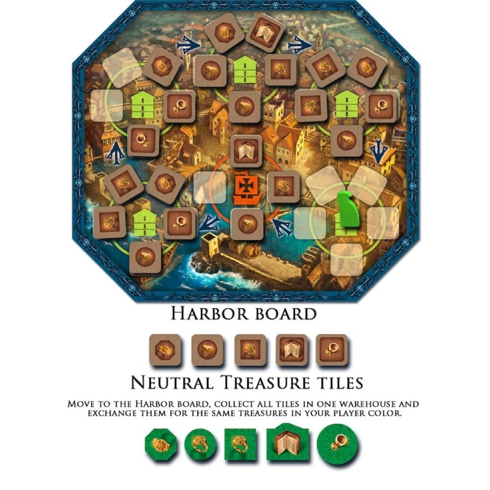 When the harbor can no longer be filled properly or when a player has placed at least one treasure in each room, the final round is triggered, then players have a final scoring for their rings still in the abbey and for the number of rooms that hold their treasure. Whoever scores the most points wins!
