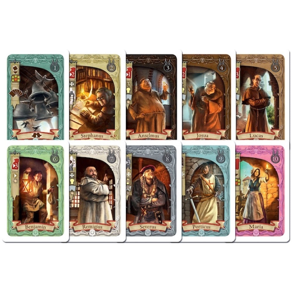 Each player has a hand of ten character cards and a starting supply of treasure: one book, one chalice, and a handful of signet rings that come in three types. A harbor with six storehouses is stocked with additional treasures, and three characters – Abbot Remigius, Vitus, and Prior Severus – are placed in the 13-room abbey.