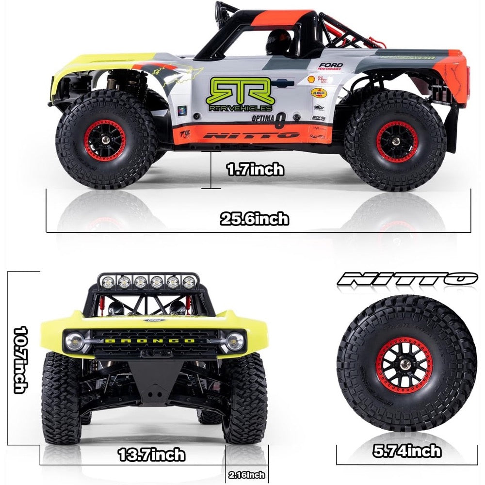Crafted by the legendary RTR Vehicles Off-Road Team, this 4400-class Ford Bronco is built for top-tier performance. Designed with an unrestricted platform, it’s not just engineered to win—it's a showcase of RTR’s relentless pursuit of off-road innovation and capability. Piloted by champions Loren Healy and Vaughn Gittin Jr., the full-size Bronco is a symbol of extreme off-road mastery—and this 1/7 scale version brings that same performance and pure RC fun to your hands.