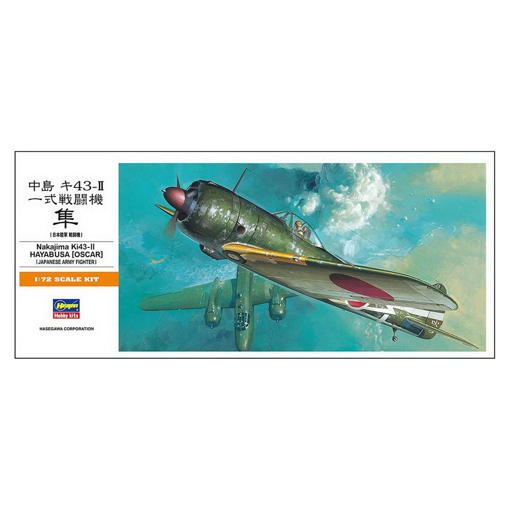 This is the 1/72 Scale Nakajima Ki43-II Hayabusa (Oscar) Plastic Model Kit from Hasegawa. Suitable for Ages 14 & Up. Marking options: One decal sheet with markings for 2 version: 1) 50th Sentai (Fighter Group) 3rd Chutai (Squadron) Sergeant Anabuki 1943 2) 59th Sentai (Fighter Group) Sergeant Major Hirohata New Guinnia 1943.
