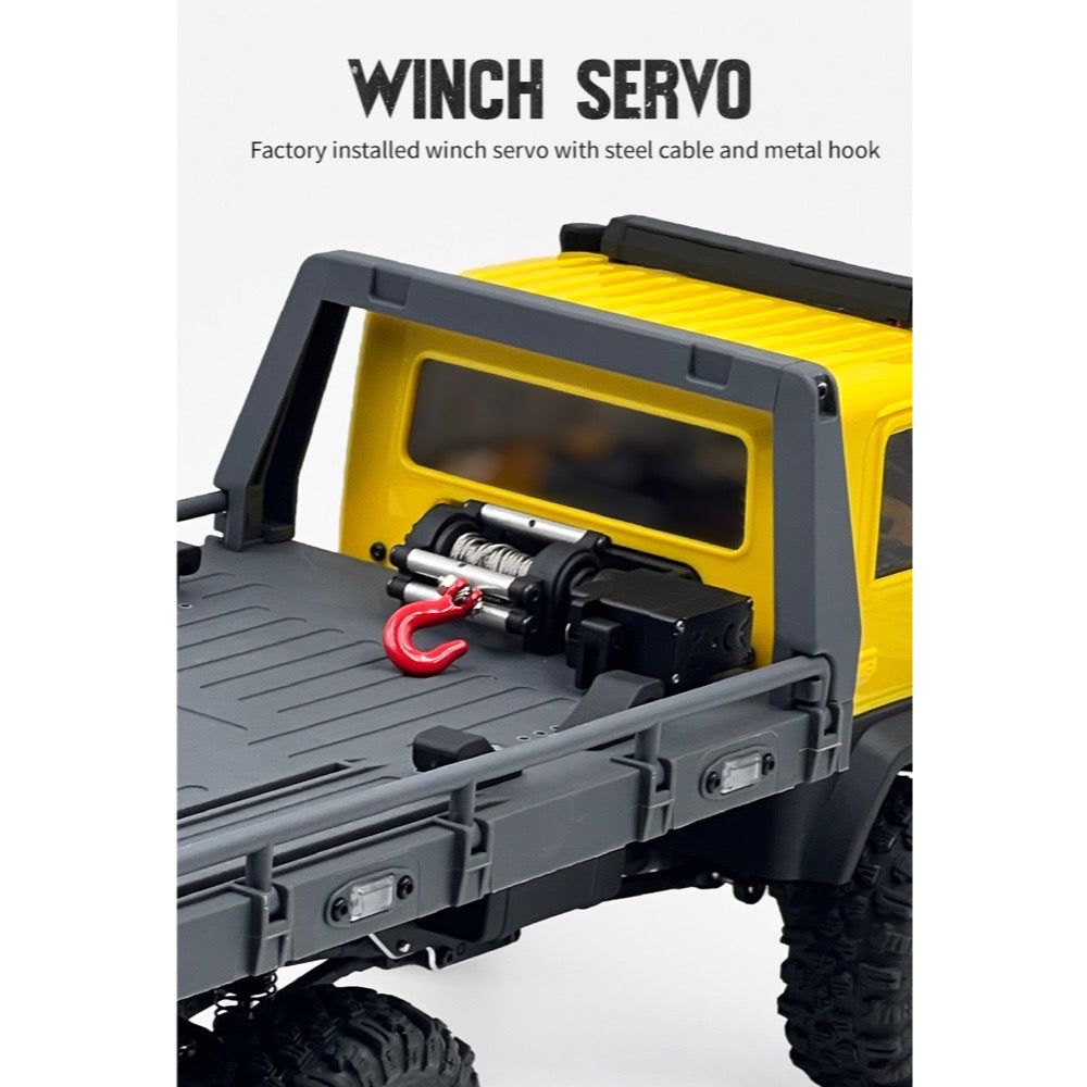 Equipped with a powerful 280-sized big block brushed motor and a 6-channel ESC receiver combo, the CR-18P delivers impressive performance and precise control. Its full-lock 6WD drivetrain, coupled with super soft 60mm Mudder crawler wheels, ensures exceptional traction on any surface, from rocky trails to muddy slopes. Plus, with its working winch and nylon moulded tow truck bed, you can easily recover stranded vehicles and add a touch of realism to your off-road adventures.