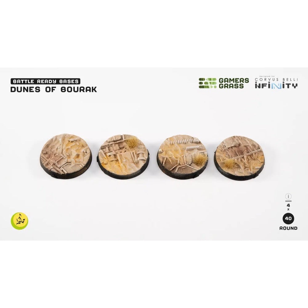• This pack contains 4 round Battle Ready Bases 40mm wide in a Dunes of Bourak theme.