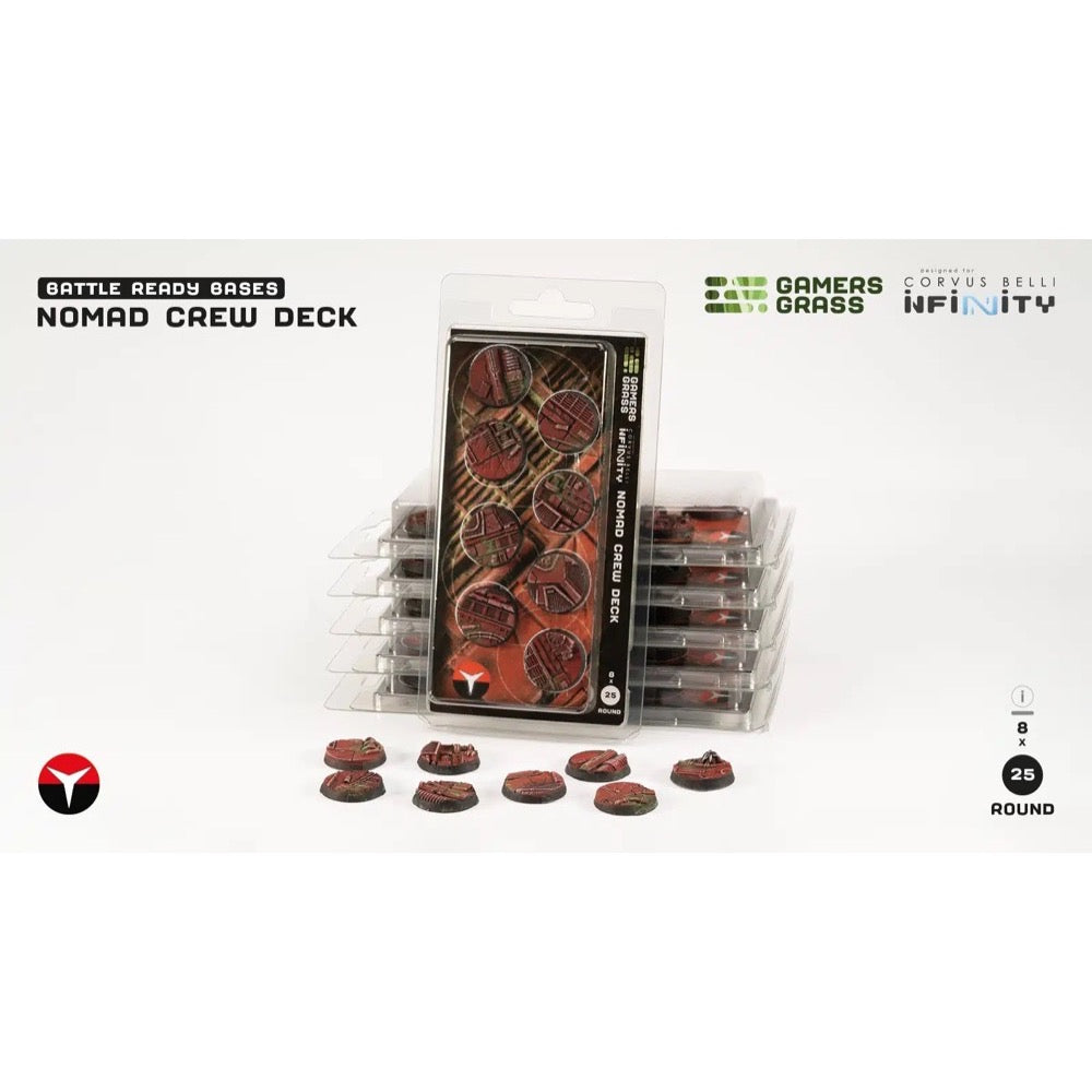 • This pack contains 8 round Battle Ready Bases 25mm wide in a Nomad Crew Deck theme.