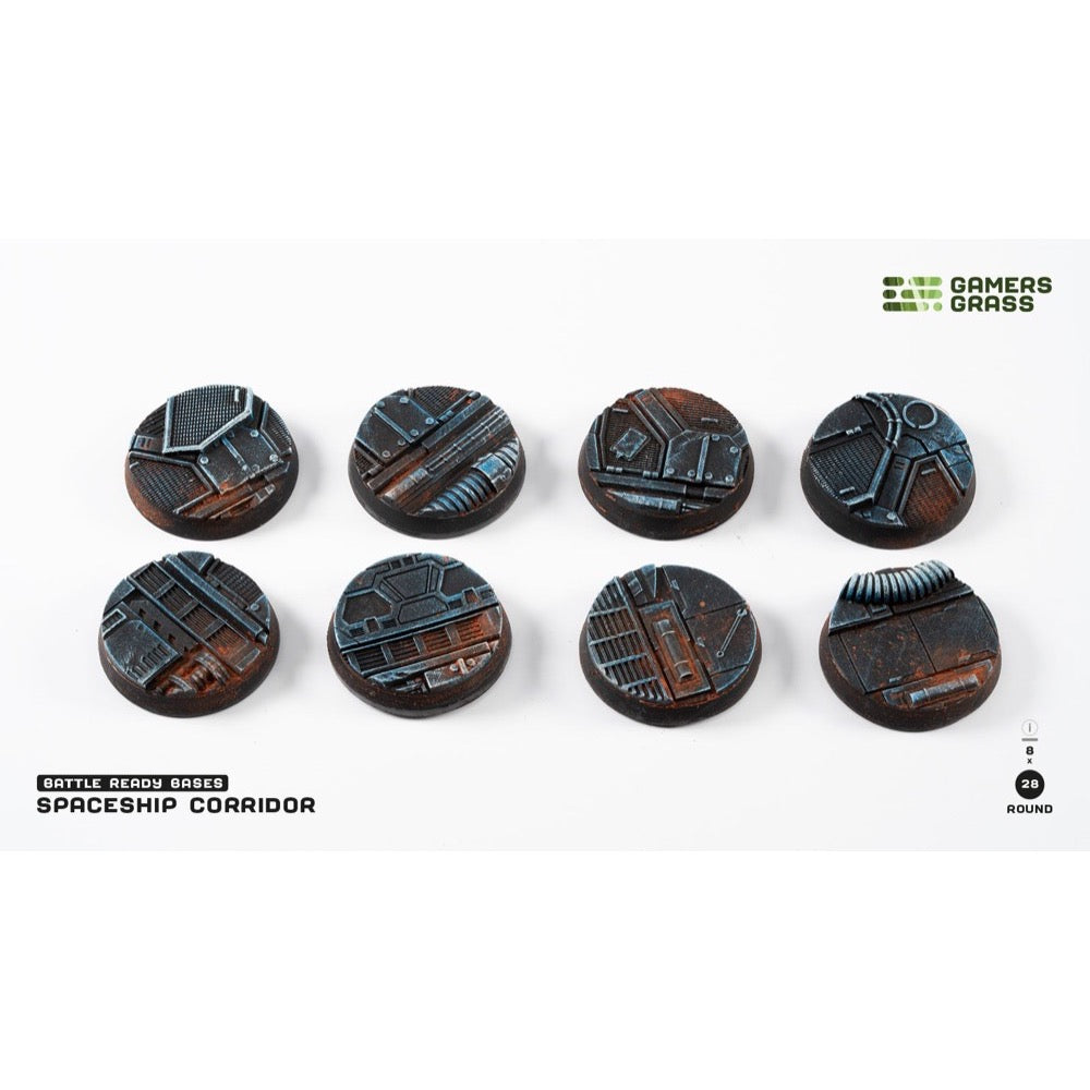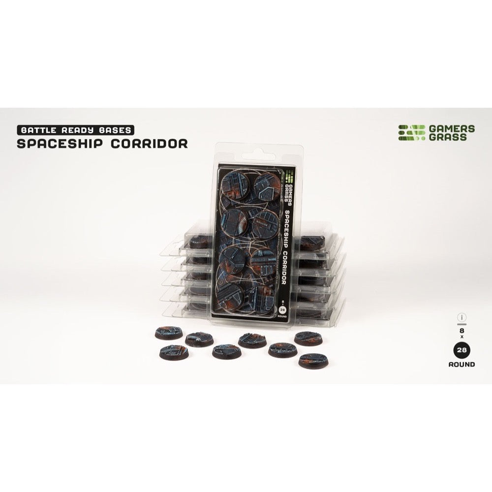 • This blister contains 8 x 28mm wide round Battle Ready Bases, in a Spaceship Corridor theme.