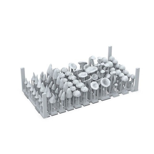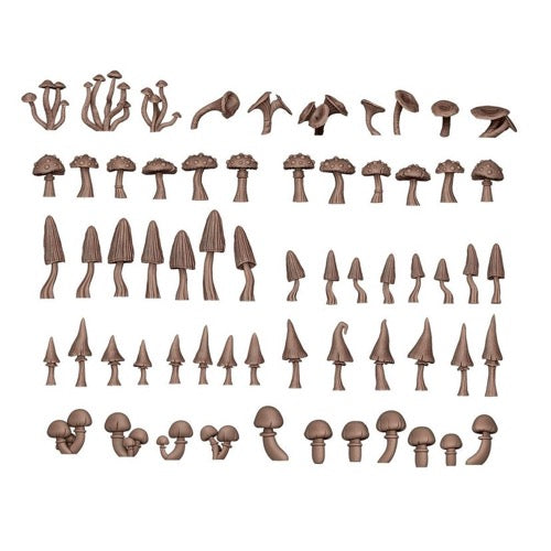 Small, detailed 3D-printed resin mushrooms of different species, ideal for adding a touch of color and fantasy to the bases of your miniatures, dioramas, or gaming tables.