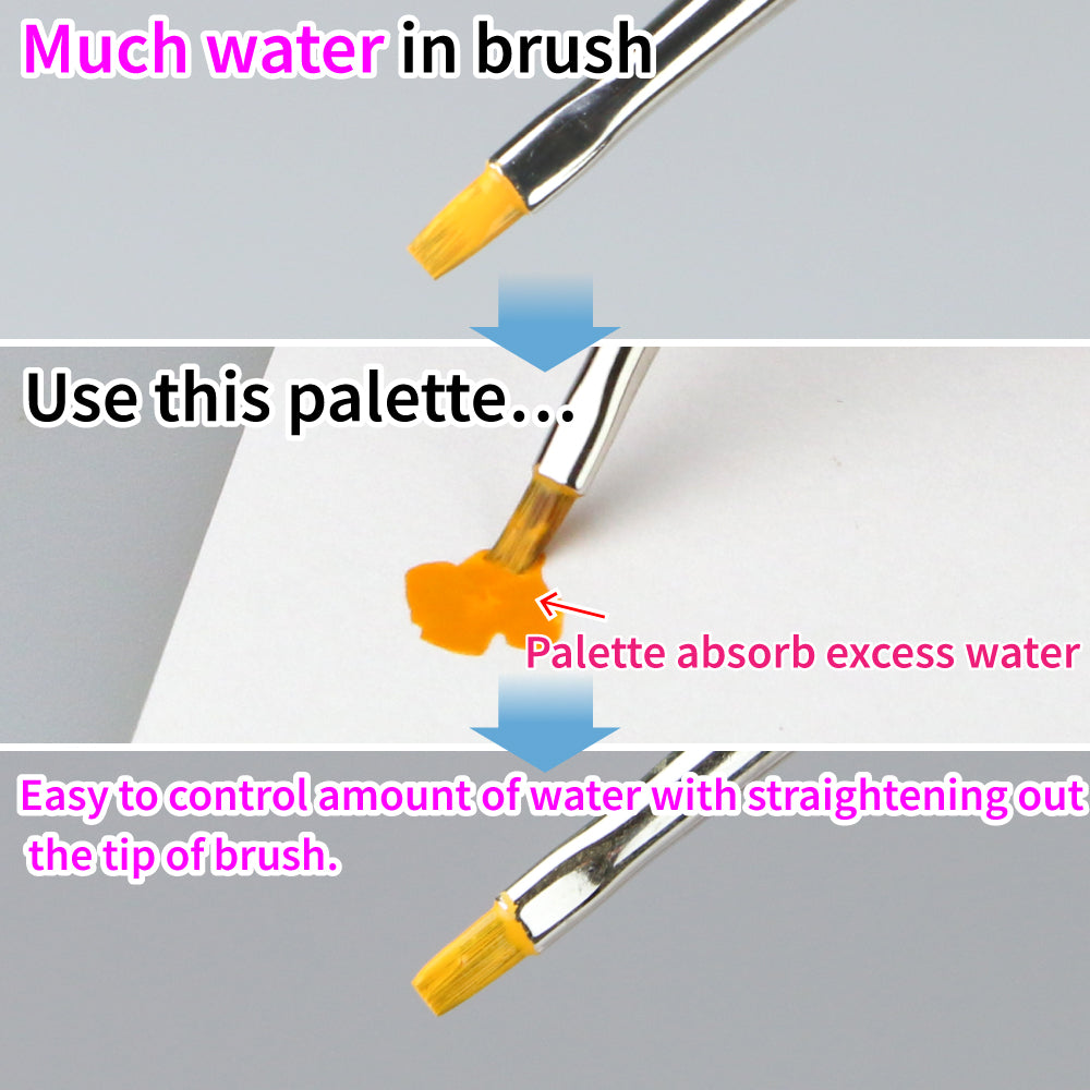 Too much paint on the brush tip may cause unexpected paint run-off or unevenness, making it hard to paint as desired. Using this palette sheet S to condition the brush tip will absorb excess water, achieving the ideal brush condition for painting.