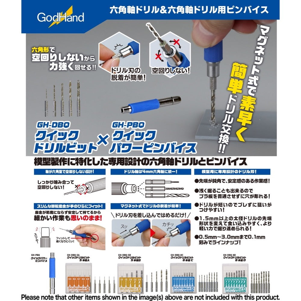 The GodHand Quick Power Pin Vise / Vice has a hexagonal shaped connection and fits tightly, so it won't spin freely. It's also magnetic, making attaching and detaching the drill blade super easy.