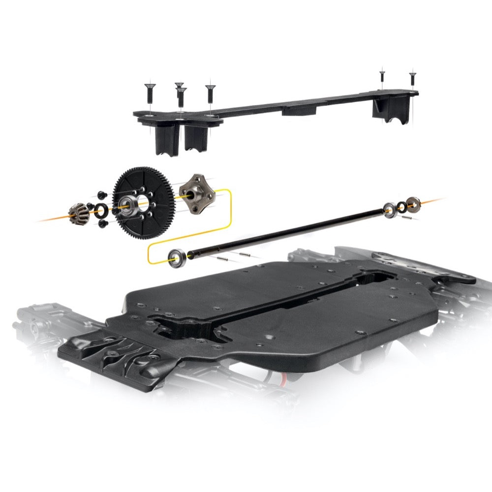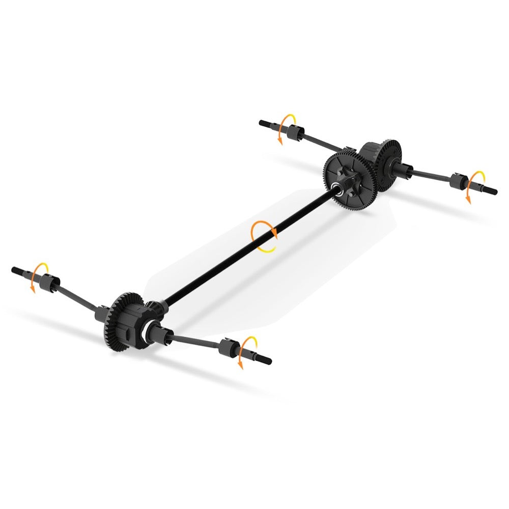 Bevel gear differentials at each end of the car transfer power from the driveshaft to the dogbones and axles that drive each wheel. The all-metal construction allows the drivetrain to withstand powerful brushless motors for easy upgrading in the future. Rubber-sealed ball bearings support the differentials and each diff can be tuned independently by changing the diff grease.