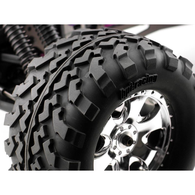 The standard GT2 tyres for the Savage X are now available pre-mounted on the cool Warlock chrome wheels! These tyres and wheels will fit Savage monster trucks and any trucks that use 17mm hex hubs and standard wheel axles. The aggressive tread pattern and grippy rubber compound are ideal for all-terrain driving, including short grass, mud, hard-packed dirt, rocks and more!