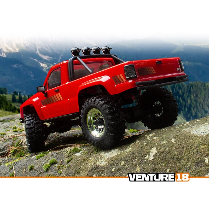 The officially licensed Toyota Hilux SR5 body included with the Venture18 RTR is completely outfitted with a range of fabulous scale items. In addition to the hand-painted polycarbonate body with clear windows, you'll find a host of scale details including a pair of real side mirrors, door handles, grills, classic tube bumpers front and rear, light buckets for the working lights, dual-tube rollbar and adjustable-width rock rails that help the truck glide over tough obstacles.