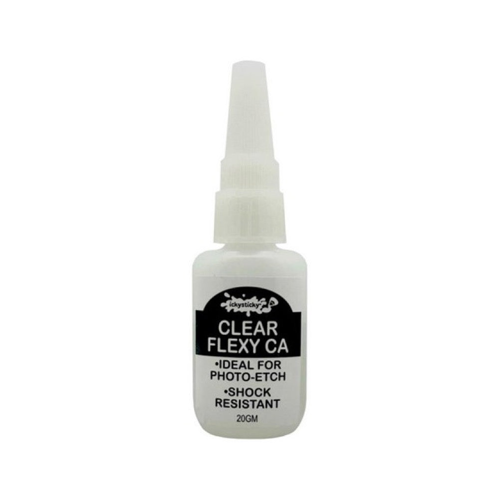 ICKYSTICKY CLEAR FLEXY CA is formulated differently to regular CA. It has a stronger bond and remains flexible when cured, meaning it is not brittle when cured. This makes it ideal for bonding dis-similar materials that require impact and shock absorbance.