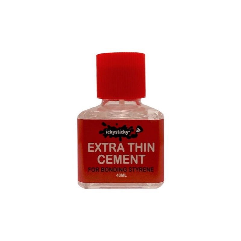 ICKYSTICKY EXTRA THIN CEMENT is a solvent based adhesive formulated to bond polystyrene plastic, commonly used in making plastic model kits. Also perfect for using on styrene sheets when creating unique and one-of-a-kind pieces.