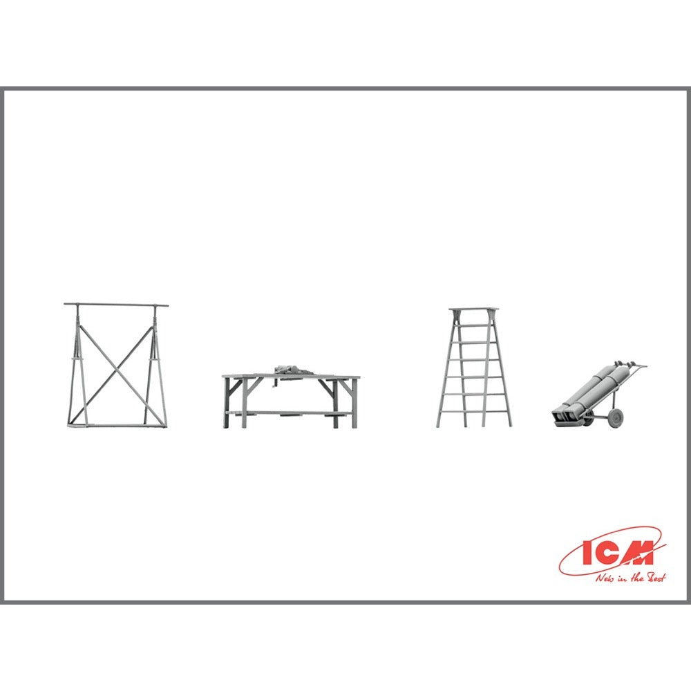 The kit includes seven figures – three pilots, three mechanics, one WREN member of WWII British Royal Air Force with dog figure and airfield equipment.