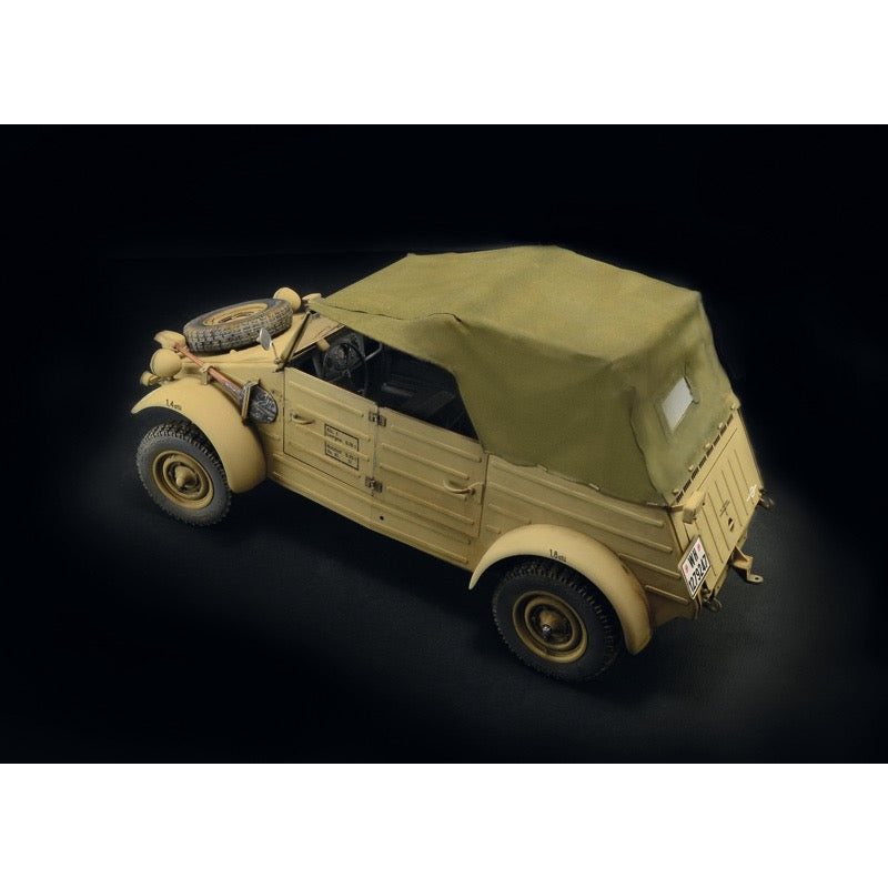 Typ 82 Kubelwagen is one of the most famous military cars of the Second World War. It was designed by the engineer Ferdinand Porsche and produced by the German manufacturer Volkswagen. The project was born to have a simple vehicle, easy to build and easy to maintain and repair. The overall vehicle design is without bends and the bodywork plates are flat. Great simplicity even in the layout of the frame : just a central tube and the back support for the engine and the gearbox. The Kubelwagen, thanks to its petrol engine with a displacement of 998 cm3, was able to reach the max speed of 80 Km/h. The vehicle did not have 4x4 traction but it was extremely reliable on all types of terrain and it was present on all fronts, often in very tough environmental conditions, where the German Army fought during the entire World War II. The Kubelwagen could be armed with a support for a MG34 or MG42 machine gun.